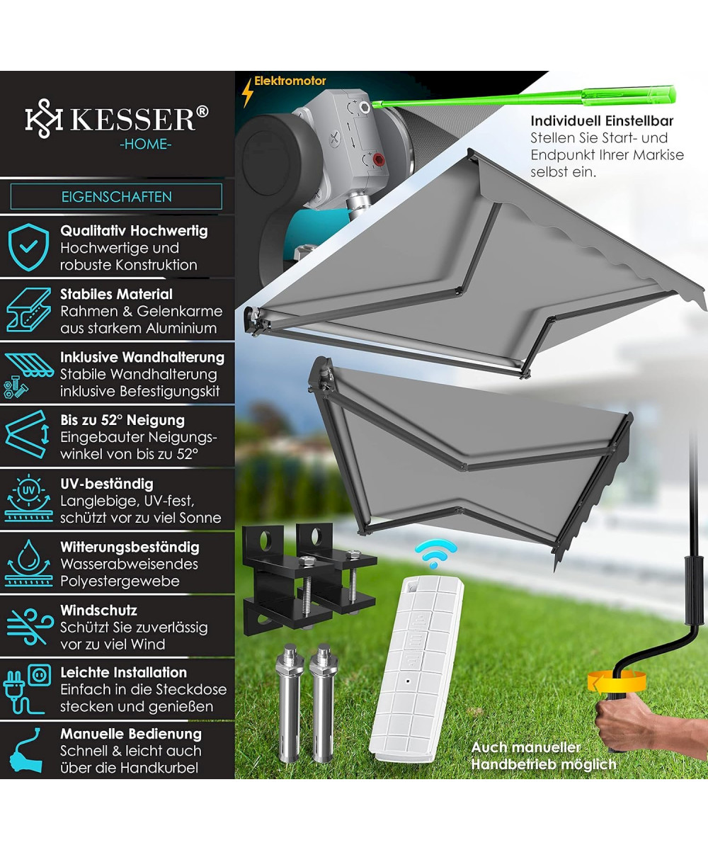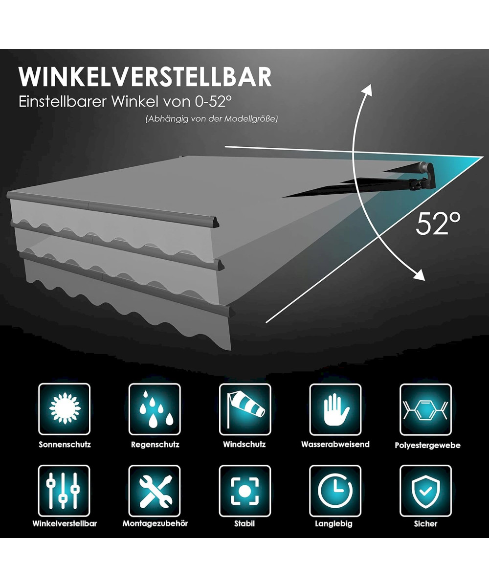 Der Sonnenschutz wird mit einer stabilen Wandhalterung inklusive Befestigungs-Kit geliefert, was eine einfache und schnelle Installation ermöglicht. Die Markise kann dabei auch alternativ manuell über eine Handkurbel bedient werden. Die individuelle Einstellbarkeit der Start- und Endpunkte der Markise ermöglicht eine perfekte Anpassung an jeden Balkon oder jede Terrasse. So kann die Sonnenmarkise optimal genutzt werden, um draußen zu sitzen, selbst bei schlechtem Wetter oder hoher Sonneneinstrahlung.