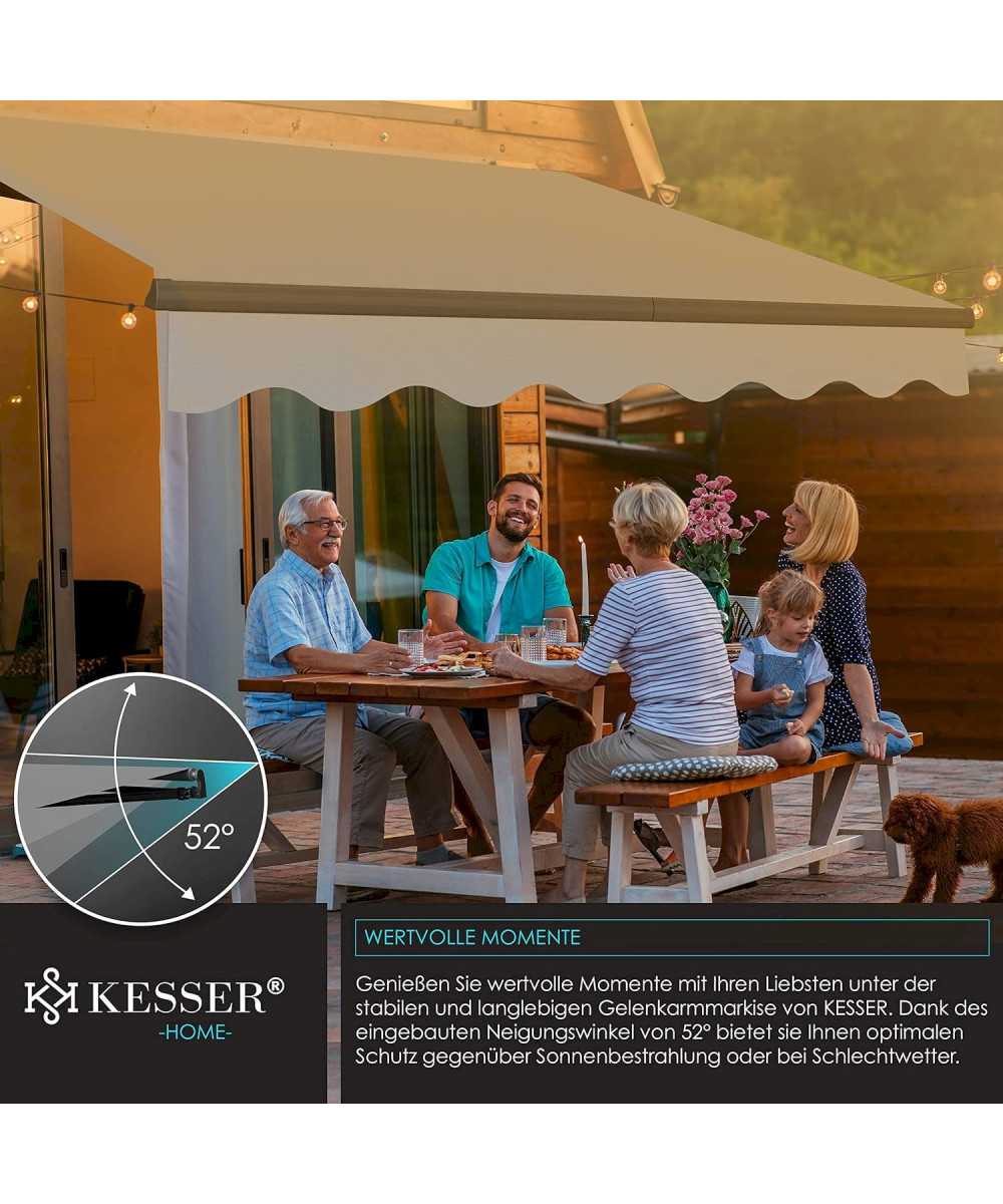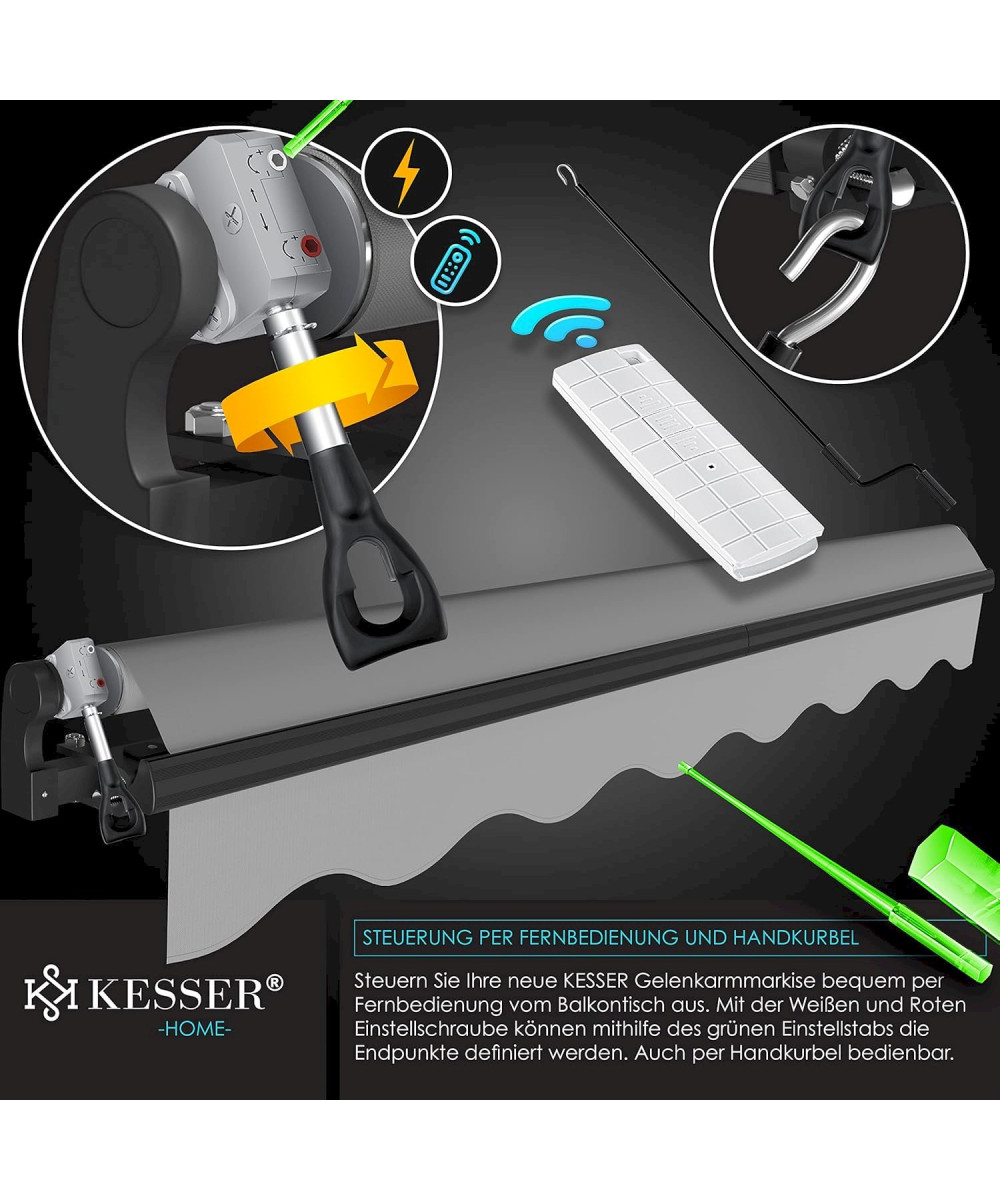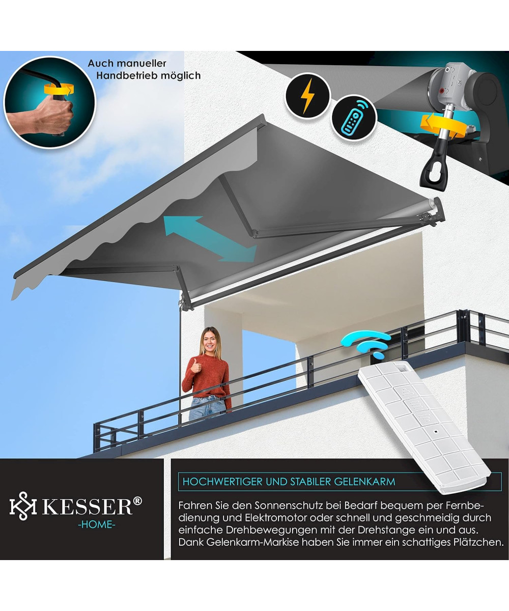 Die Balkonmarkise aus dem Hause KESSER ist einfach per Fernbedienung und Elektromotor durch Drehbewegungen ein- und auszufahren. Die Bedienung ist dabei besonders einfach und intuitiv, was eine schnelle und bequeme Nutzung ermöglicht. So können Sie jederzeit den gewünschten Sonnenschutz genießen, ohne aufwendig manuell ein- oder auszufahren.