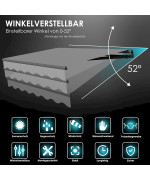 Der Rahmen und die Gelenkarme sind aus starkem Aluminium gefertigt und bieten eine hohe Stabilität und Zuverlässigkeit. Dabei sind die Gelenkarme mit einem robusten Doppel-Seilzug ausgestattet, der ein geschmeidiges Öffnen und Schließen ermöglicht. Der eingebaute Neigungswinkel ermöglicht eine individuelle Einstellung der Neigung bis zu 52°, um den Schatten immer perfekt an Ihre Bedürfnisse anzupassen.