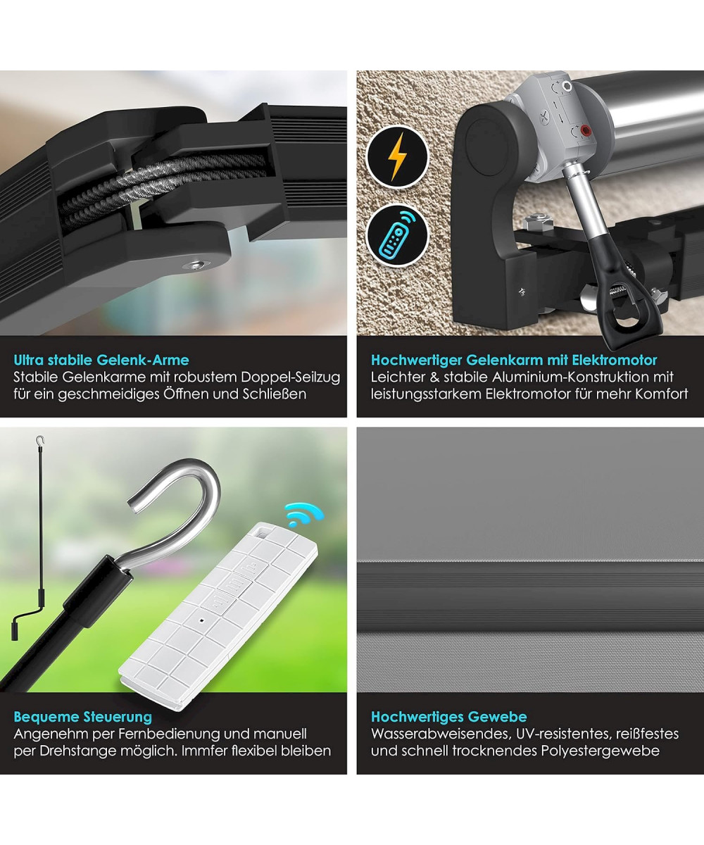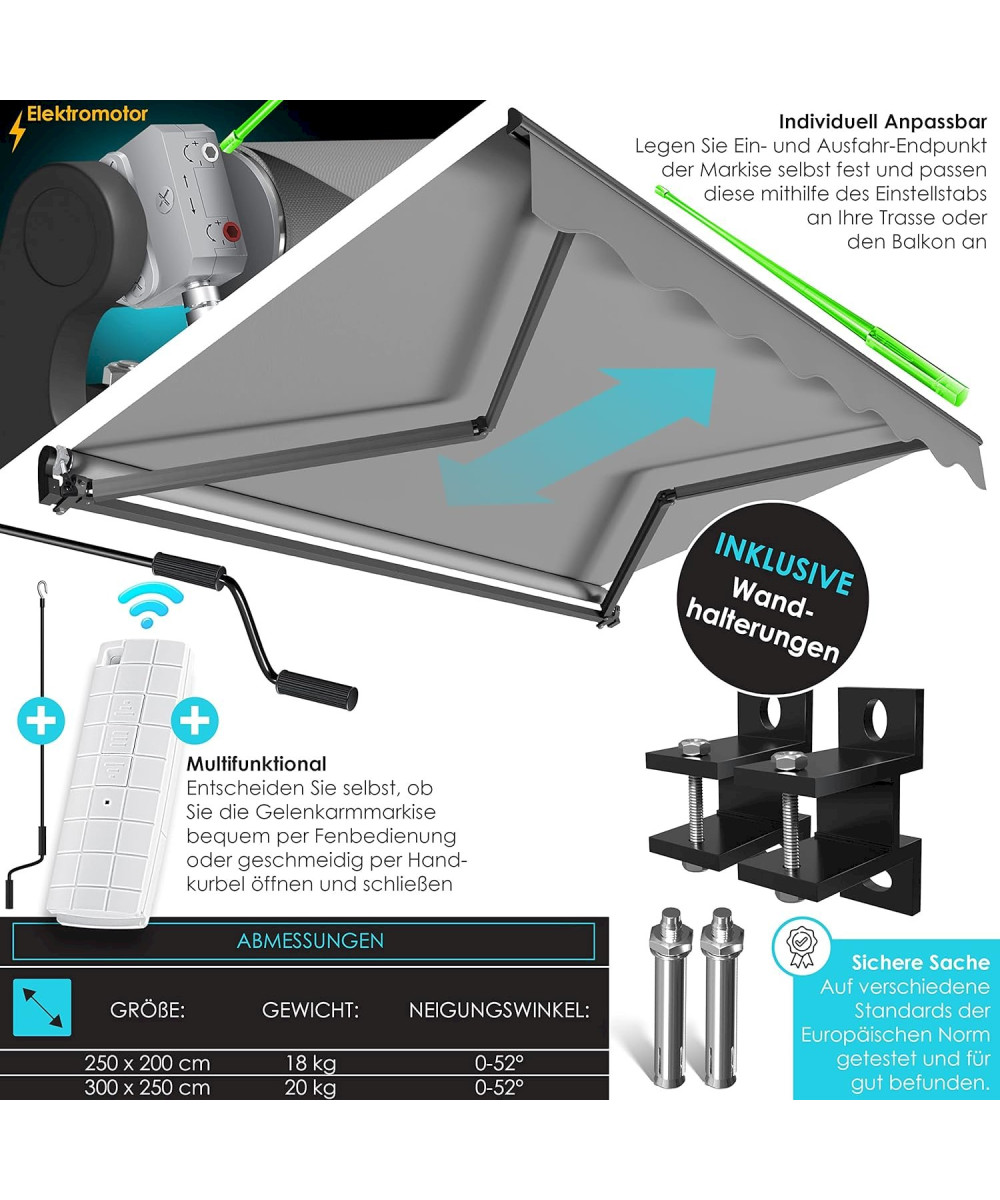 Elektrische Gelenkarmmarkise mit Fernbedienung 300x250cm grau inkl. Wandhalterung