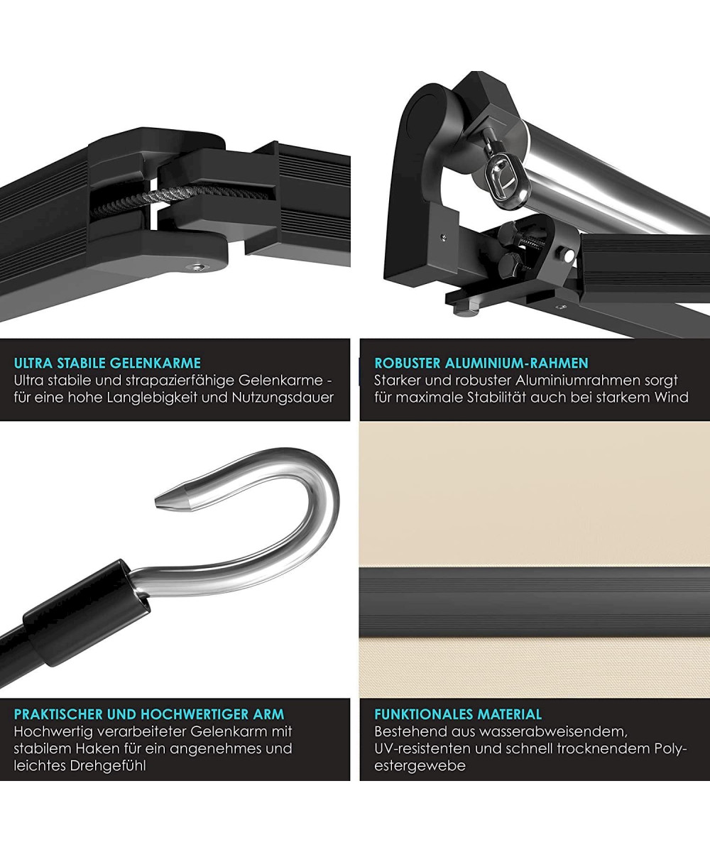 Ultra stabile und strapazierfähige Gelenkarme garantieren Ihnen eine hohe Langlebigkeit und Nutzungsdauer . Zudem sorgt ein starker und robuster Aluminiumrahmen für maximale Stabilität und das sogar bei starkem Wind . Durch die Verarbeitung von hochwertigem Aluminium ist die Bildung von Rost ausgeschlossen , dadurch glänzt die Balkonmarkise auch noch nach mehreren Jahren .