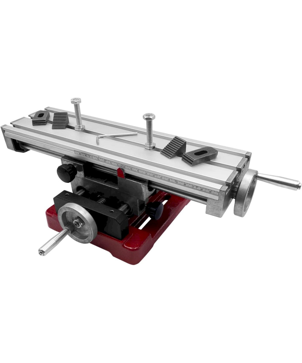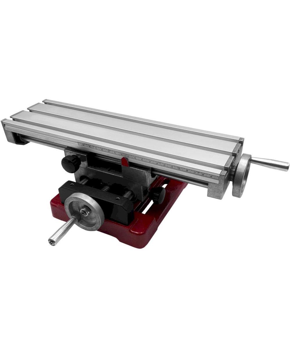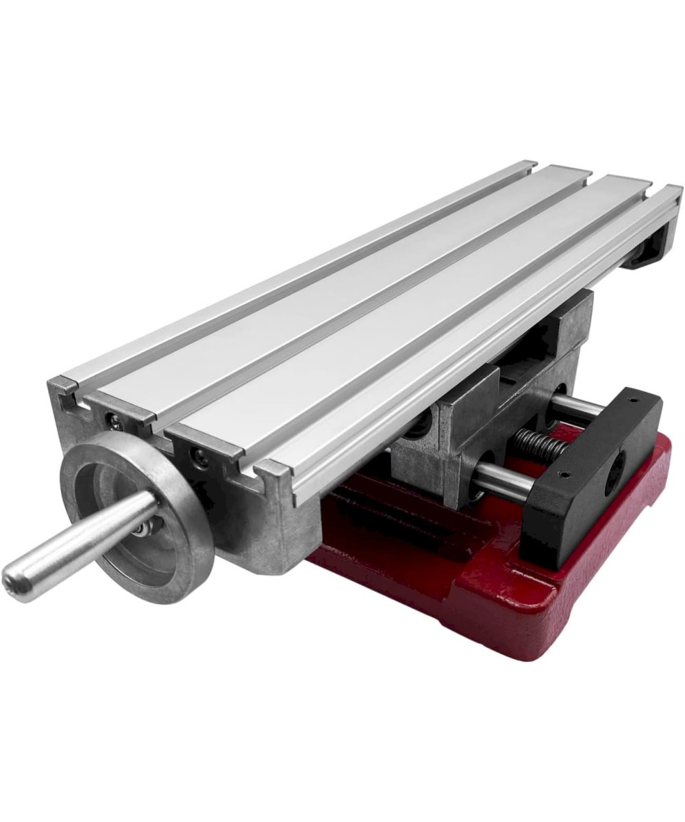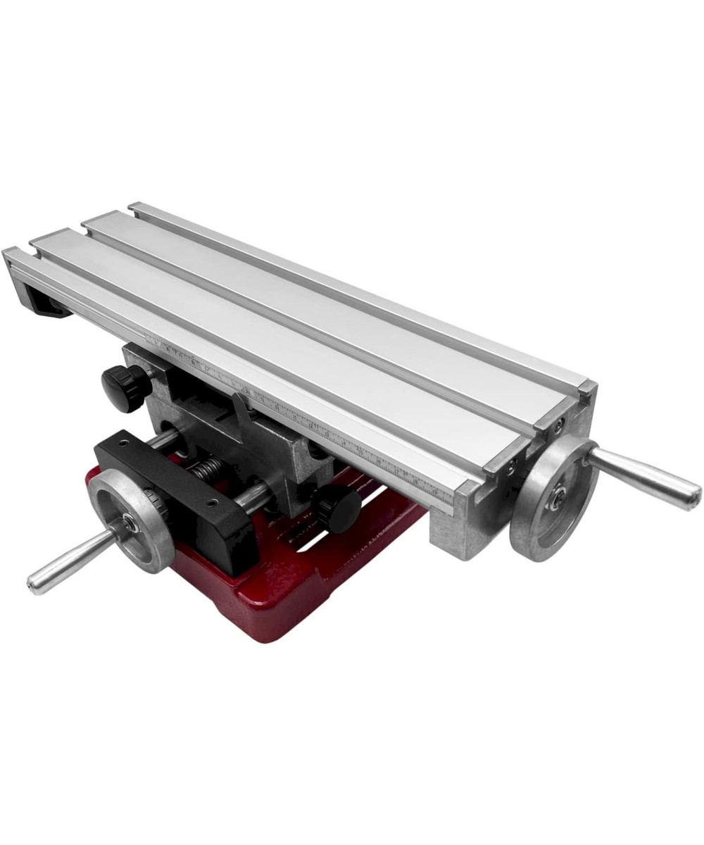 Bei diesem Kreuztisch sind der Aufspanntisch und der Support aus Aluminium gefertigt. Dadurch eignet er sich insbesondere für leichte Bohr- und Fräsarbeiten. Der Sockel besteht aus Guss, die Spindeln und Rundsäulen aus Stahl. Der Arbeitstisch verfügt über drei durchgehende T-Nuten mit einer Breite von 8 mm für Nutensteine mit M6-Gewinde. Das Werkstück wird z. B. mit Spannpratzen, Niederhaltern o. Ä. in der gewünschten Position auf dem Arbeitstisch fixiert. Der Kreuztisch kann über die Handräder in X- und Y-Richtung verfahren werden. Über eine verschiebbare Messskala an der X-Achse lässt sich der Verfahrweg einfach und schnell ablesen. Beide Achsen sind präzise rundsäulengeführt und zusätzlich beidseitig kugelgelagert. Sowohl X- als auch Y-Achse lassen sich mittels Klemmschraube fixieren.