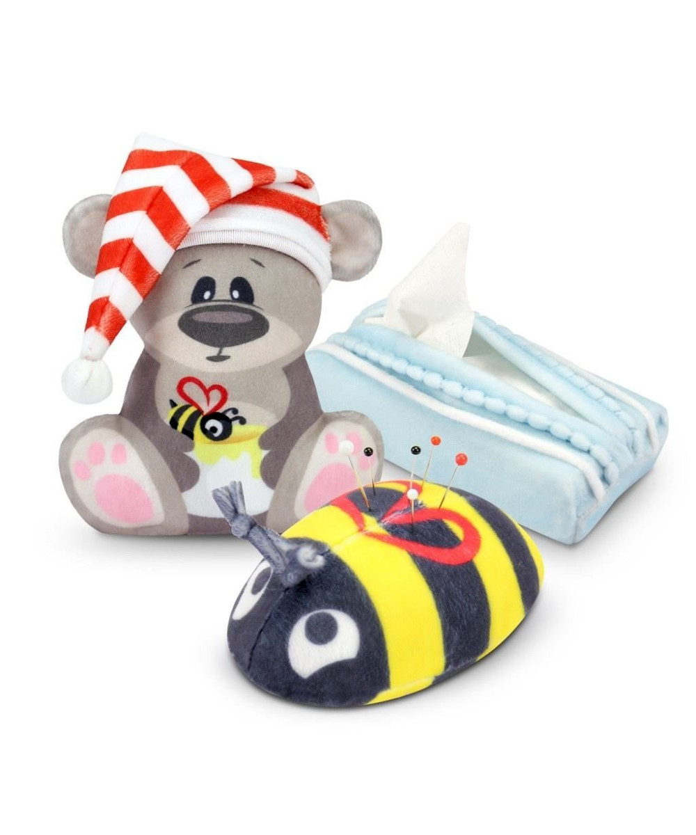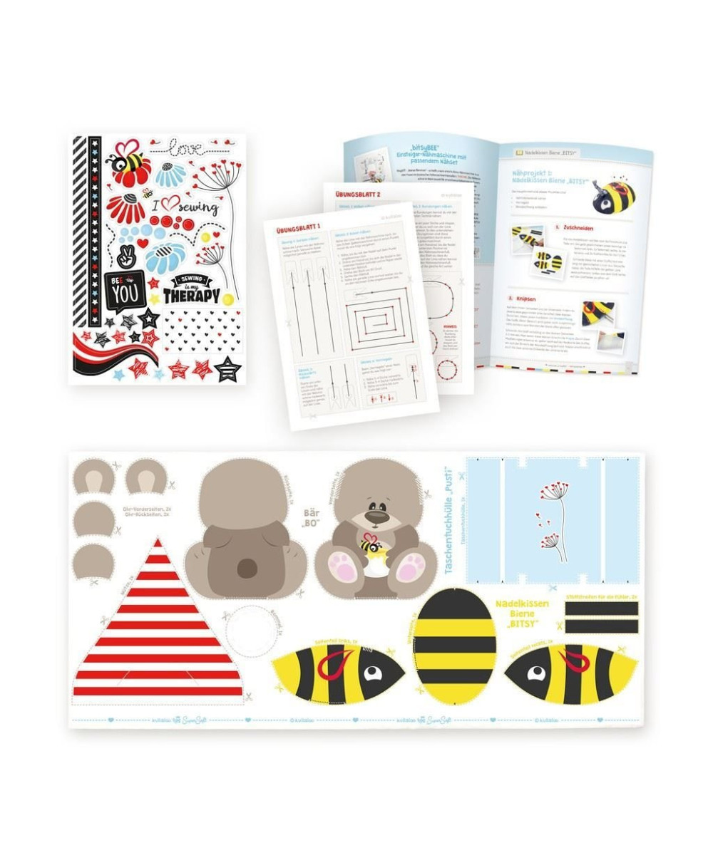 Mit dem beigelegten Stickerbogen wird deine bitsyBEE nach deinem eigenen Geschmack gestaltet, egal ob schlicht und elegant mit Pusteblumen, suß mit der kleinen Biene BITSY oder doch etwas cooler mit lässigen Statement-Aufklebern. Außerdem ist im bitsyBEE Gesamtpaket ein Vordruck fur drei kleine Nähprojekte auf unserem kuscheligen kullaloo Plusch enthalten. Mit dem Nadelkissen-Bienchen „BITSY“, der Taschentuchhulle „PUSTI“ und dem Bär „BO“ mit seiner sußen Bommelmutze findest du einen super Einstieg und kannst deine Maschine nach und nach kennenlernen.