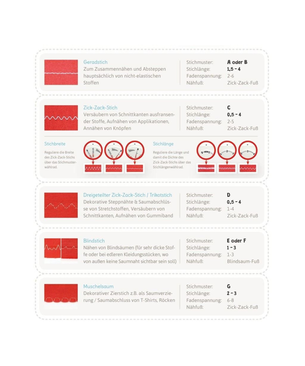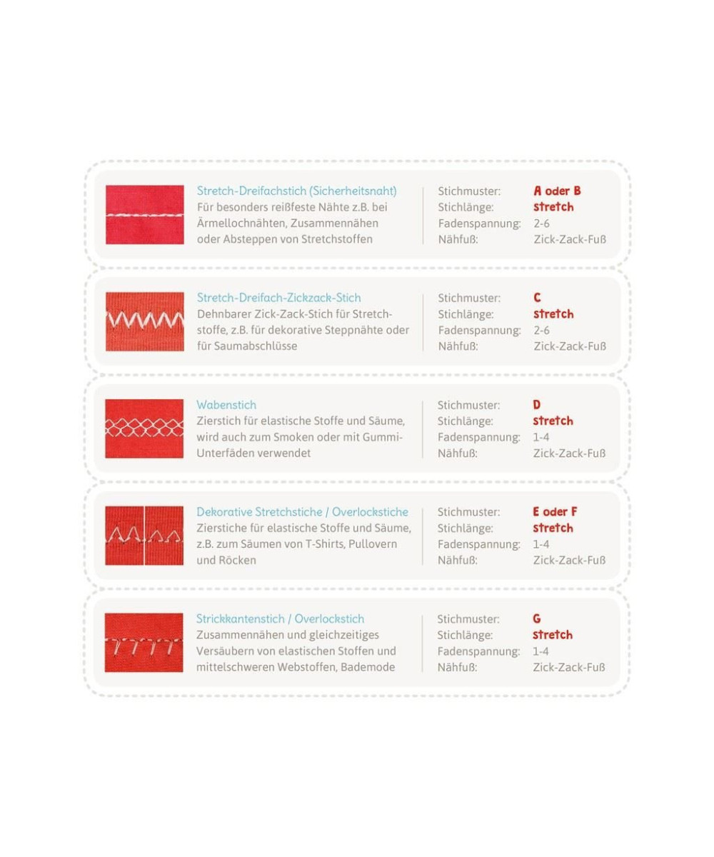 - Kurzanleitungen mit Fotos für die wichtigsten Funktionen und Anwendungsbereiche, z.B. Nähen mit elastischen Stoffen