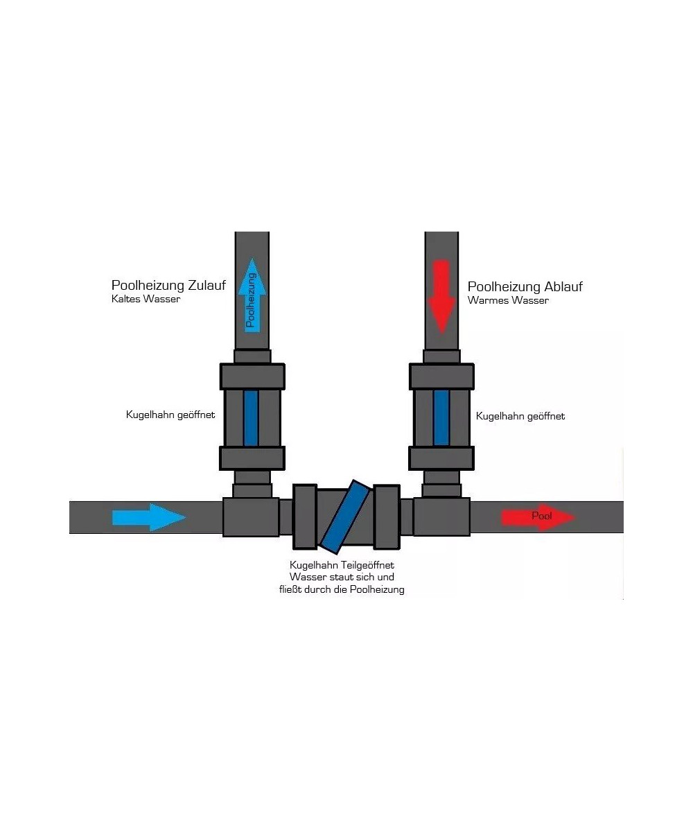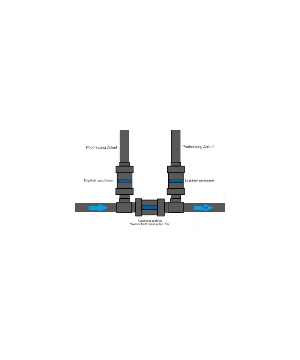 Der Bypass ist so konzipiert, das mit Hilfe Ihrer Sandfilteranlage das Wasser zur Wärmepumpe transportiert wird. Dabei zweigt das Bypass Set etwas Wasser aus Ihrem Pool ab und leitet dieses weiter an die Wärmepumpe. Das Wasser kehrt anschließend wieder in den normalen Kreislauf zurück.