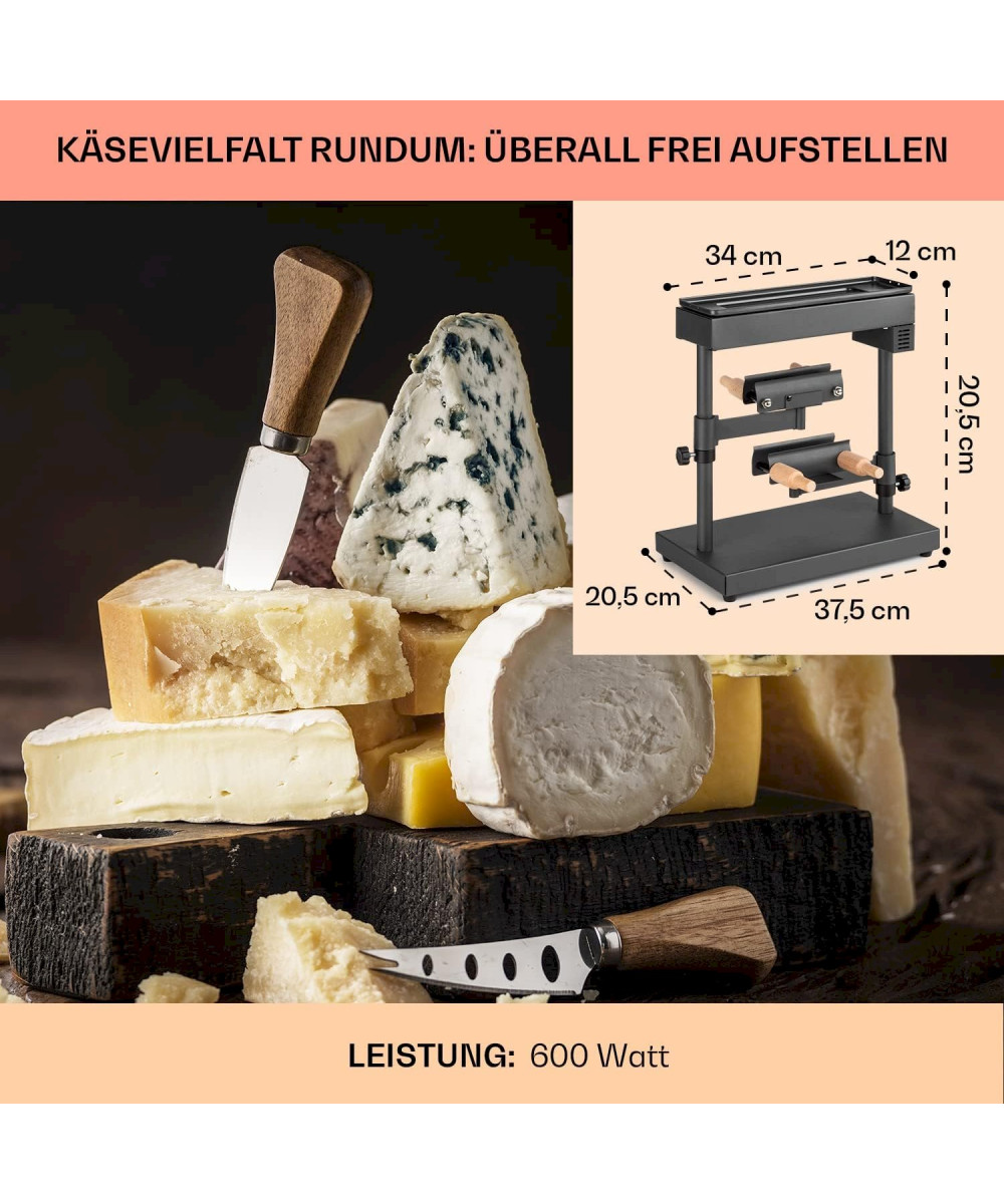 So genießt du Raclette auf die traditionelle Art: Edel gereifter Käse, vom Block geschmolzen und auf Baguette, Kartoffeln, Fleisch oder Gemüse verteilt. Dazu spannt ihr den Käse direkt im Käseträger ein und positioniert ihn unter dem 600 Watt starken Heizelement. Und damit ihr nicht so lange auf die nächste heiße Schmelze warten müsst, hat das Klarstein Appenzell XL Stand-Raclette gleich zwei solcher Träger. So schmilzt der eine Käse, während der andere gerade eure Genießerlust befriedigt. Per Höhenverstellung bestimmt ihr unkompliziert, wie schnell der Käse seine cremige Konsistenz erlangt und wie stark er dabei gebräunt wird. Beide Käseträger lassen sich zur Seite herausschwenken und horizontal kippen, um den Käse ganz einfach und komfortabel auf euren Tellern zu verteilen. Natürlich könnt ihr die Heizleistung auch über den integrierten Thermostatregler einstellen, damit ihr auch auf der topseitigen, antihaftbeschichteten Grillplatte die gewünschte Temperatur erreicht und Würstchen, Brokkoliröschen oder Kartoffelecken passend zum Käse fertig werden. Das perfekte Zusammenspiel für euren Käse-Genussabend.