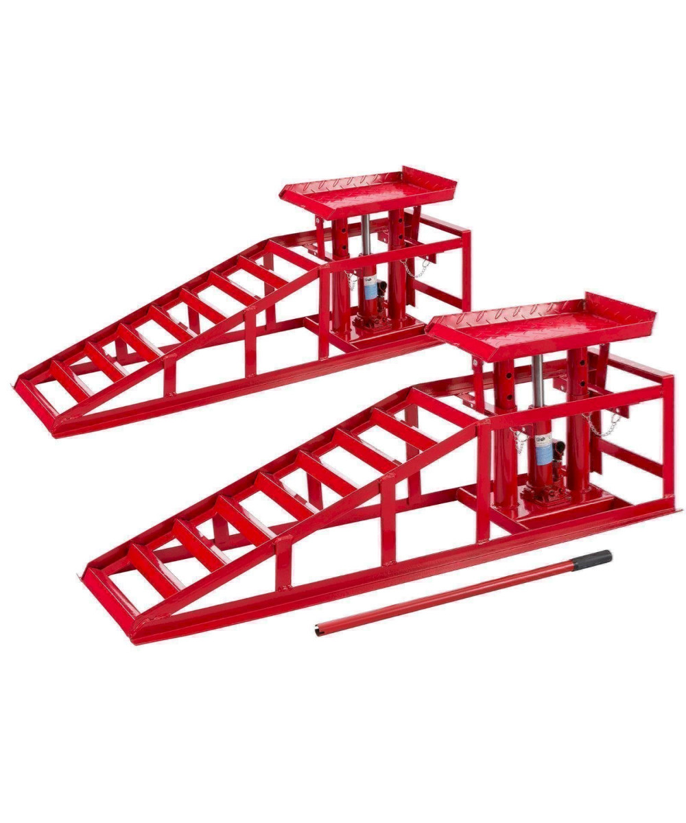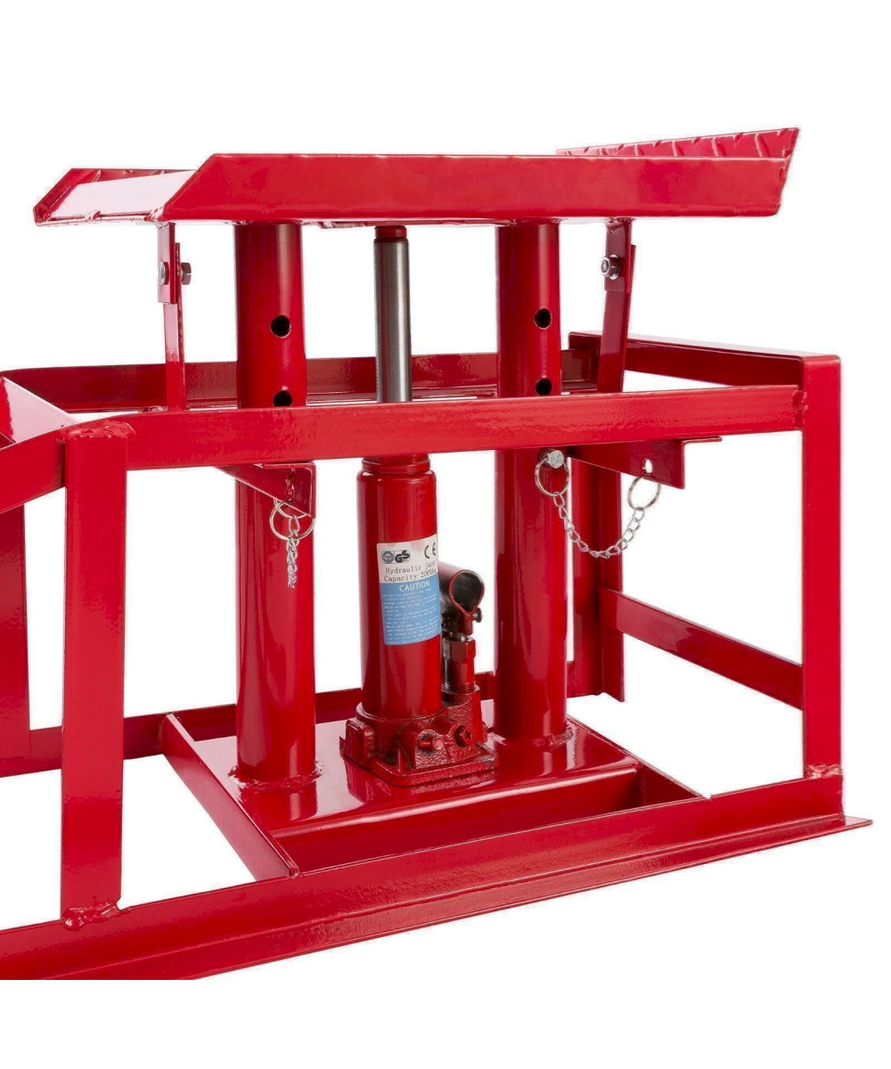 Die äußerst stabile Stahlkonstruktion mit einer Belastbarkeit bis zu 2000 kg / 2 t je Rampe besteht aus einer breiten Auffahrrampe mit einer Überfahrkante, einer höhenverstellbaren Hebeplattform sowie einem Hydraulikzylinder, der ebenfalls als Hydraulik-Wagenheber verwendet werden kann.