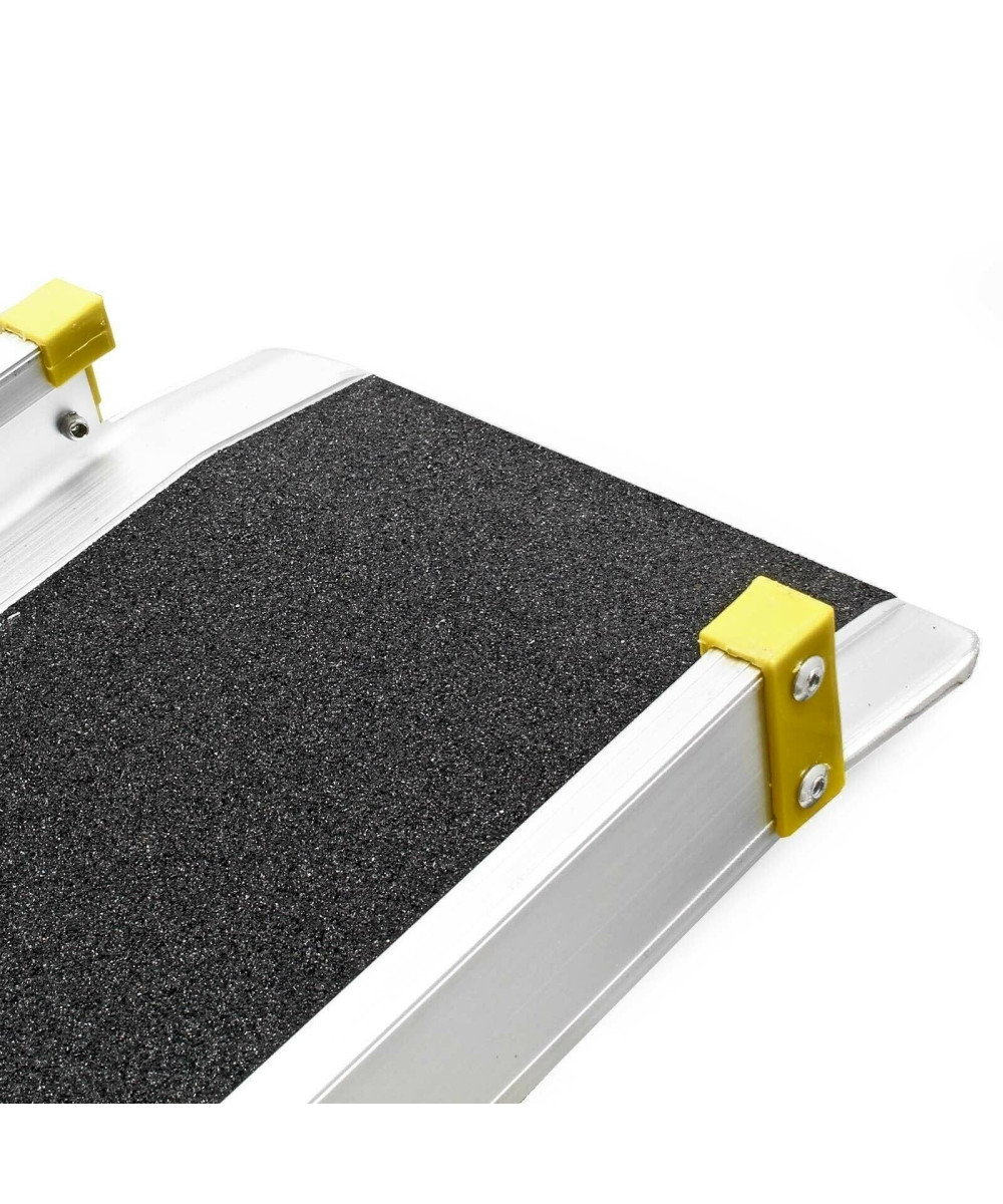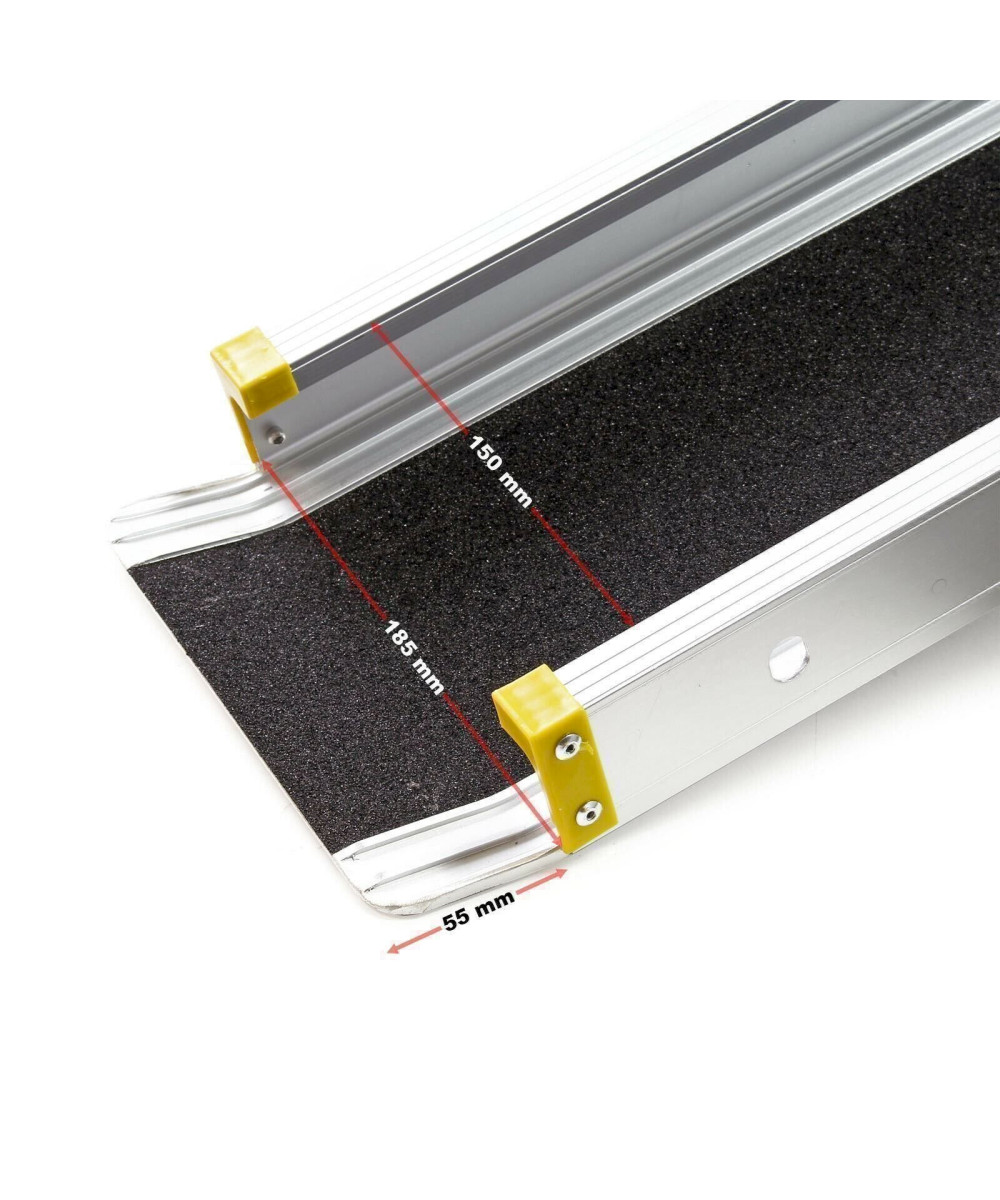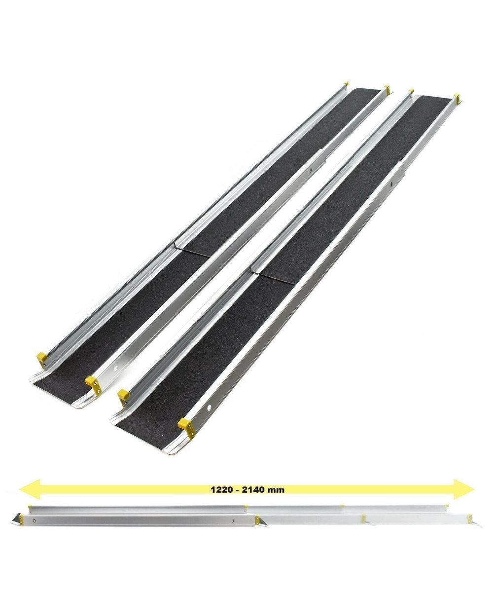 Die stabile Rampe ist aus hochwertigem Aluminium gefertigt. Durch das Material ist die Rampe nicht nur robust, sondern auch leicht und kann problemlos getragen werden. Ein weiterer Vorteil ist ihre Teleskopierbarkeit. Das heißt, die Rampe kann eingeklappt und auf kleinstem Raum verstaut werden. Aufgrund der Ausziehbarkeit der Rampe reicht ihre Länge von 121,5 bis 213,5 cm.