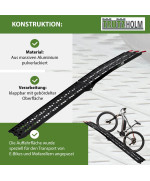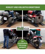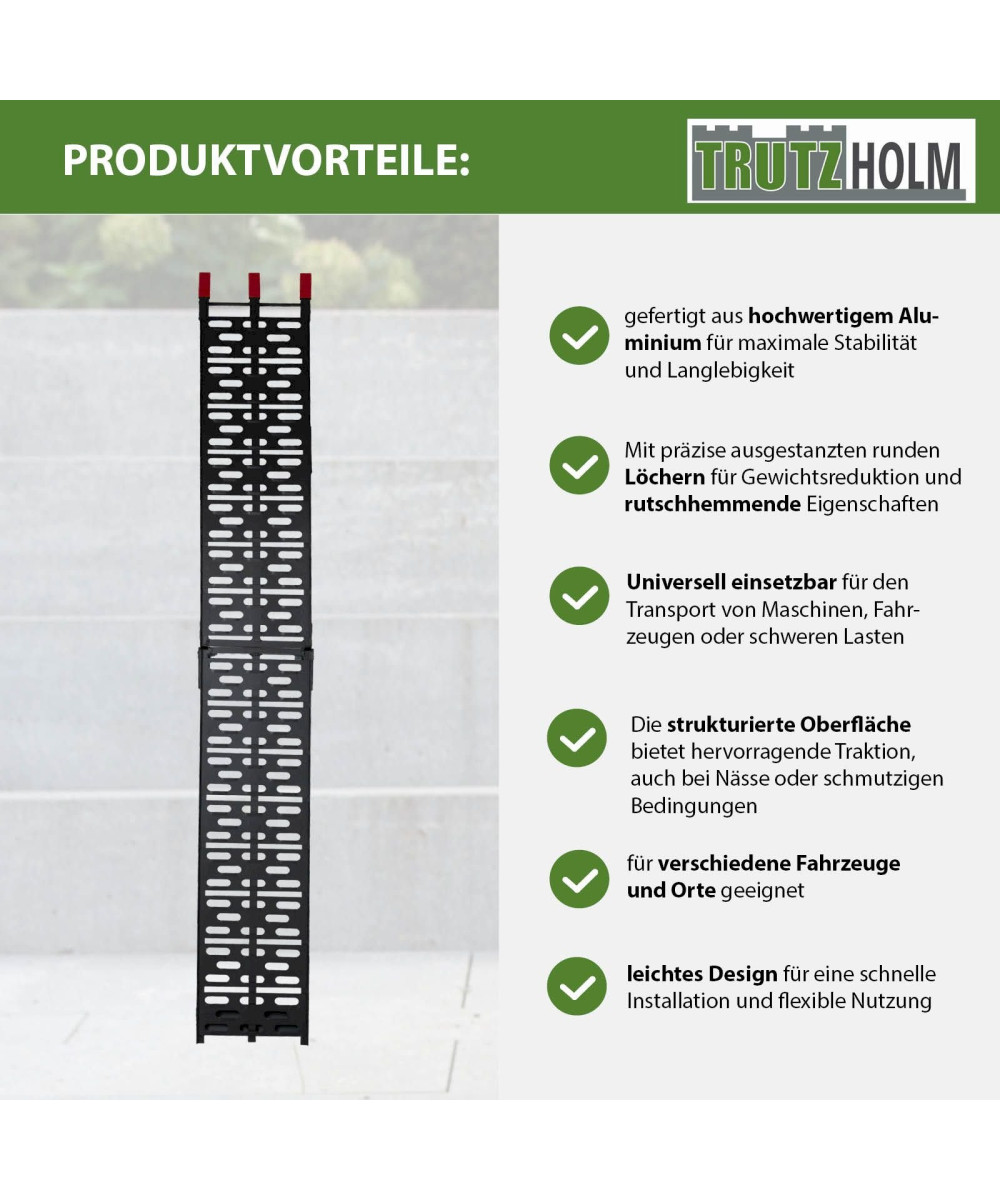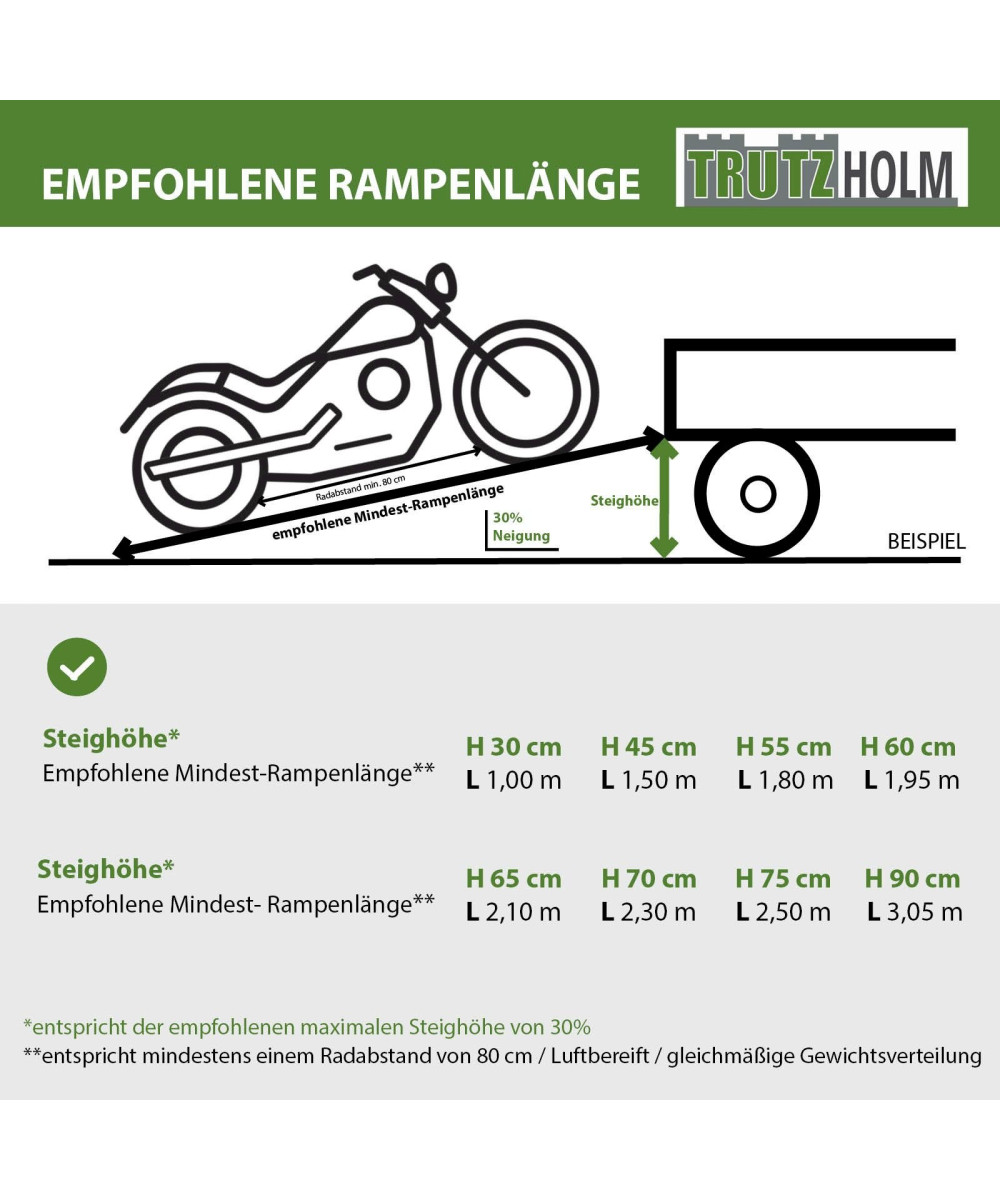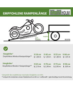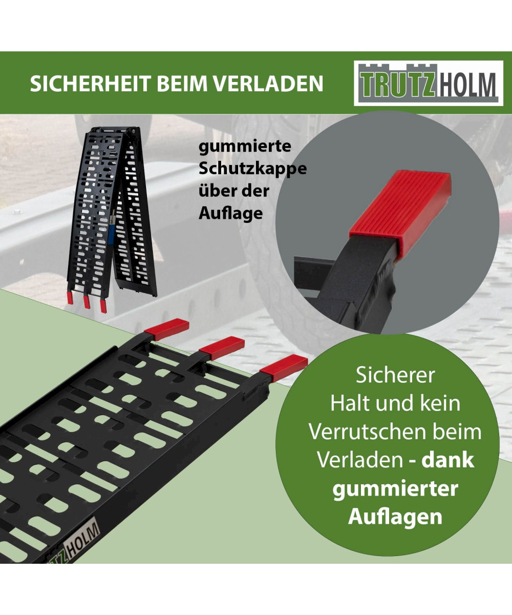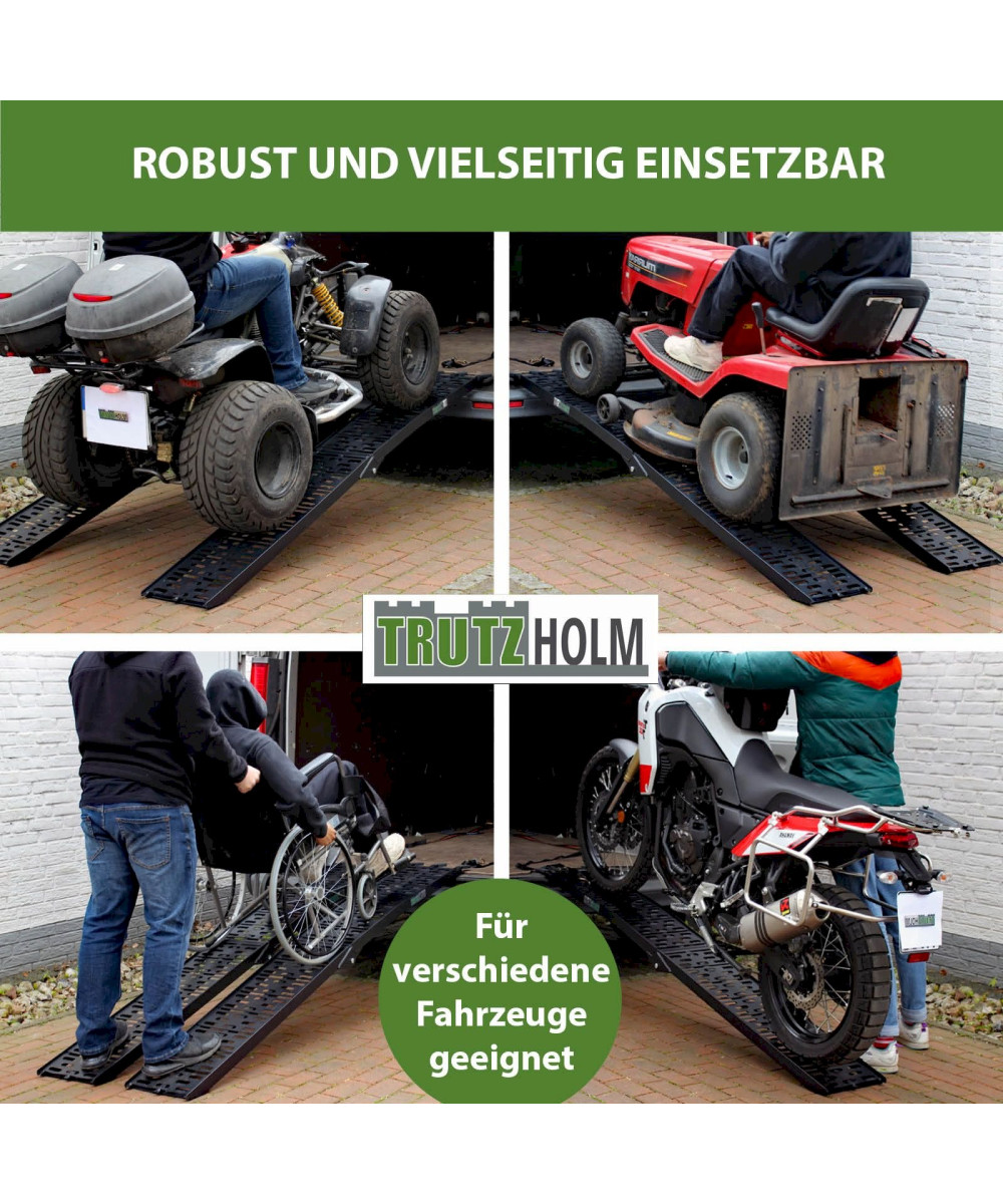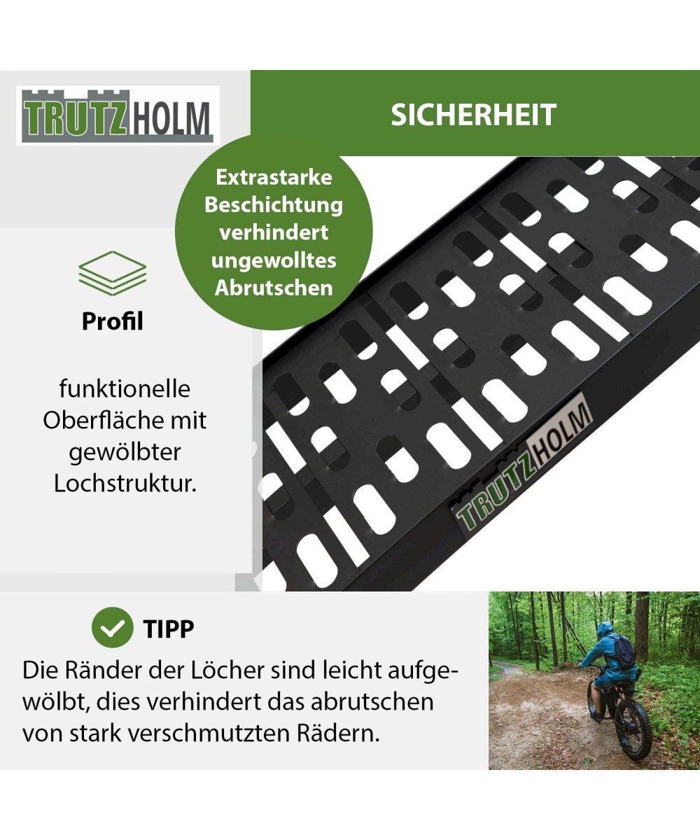 Die TRUTZHOLM Aluminium Auffahrrampe in edlem Schwarz ist die perfekte Lösung für alle Motorradfahrer und Anhängerbesitzer. Mit einer Tragkraft von bis zu 340 kg je Rampe ermöglicht sie das sichere Verladen von Motorrädern, Rollern, E-Bikes und anderen einspurigen Fahrzeugen. Die großzügige Lauffläche mit gebördelten Löchern sorgt für optimalen Halt, selbst bei anspruchsvollen Bedingungen.