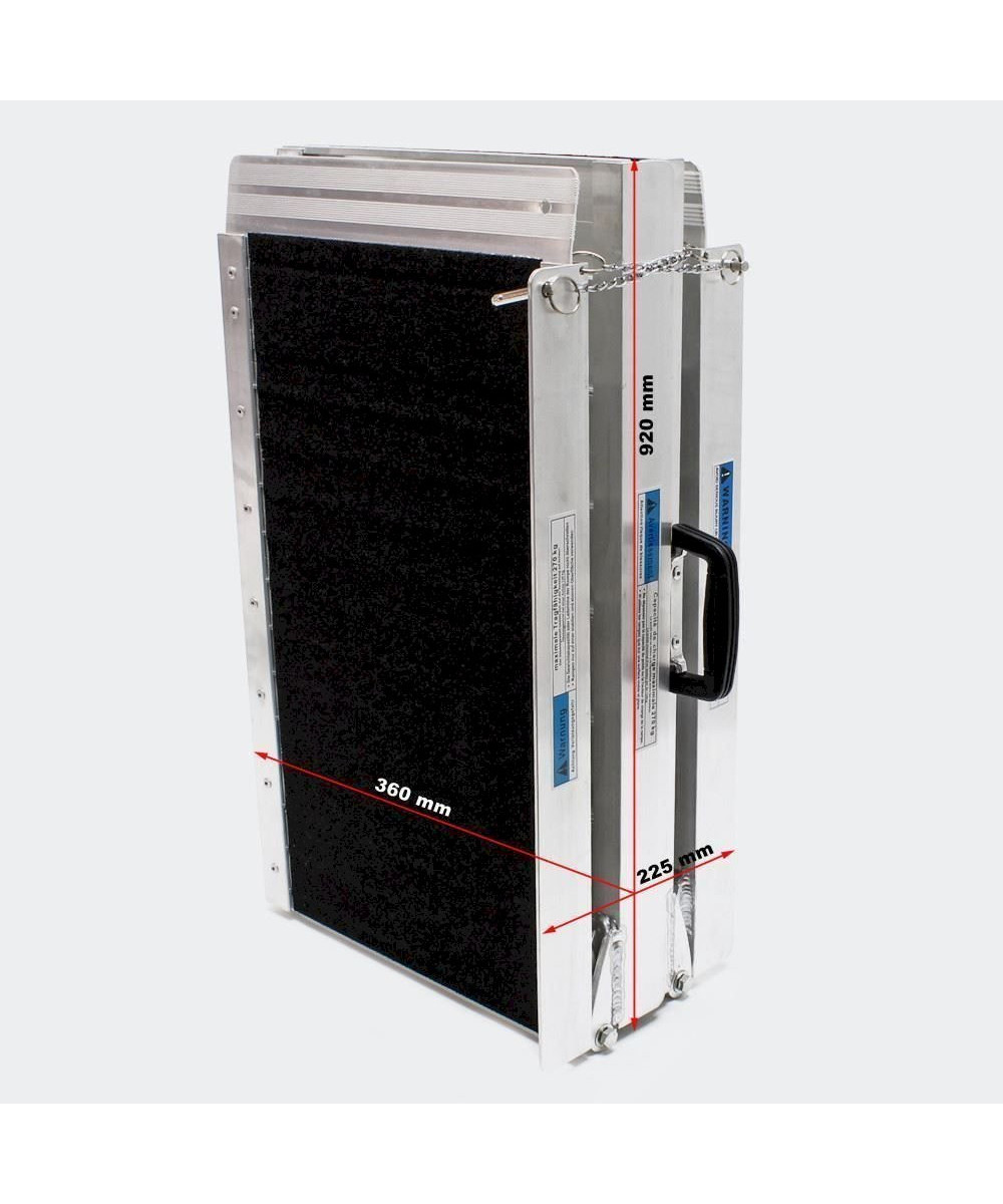 Die Rampe lässt sich einfach mit einem Handgriff in Längs- und Breitrichtung falten und wie ein Koffer am dafür vorgesehenen Griff bei einem Eigengewicht von nur 16 kg leicht transportieren. Sie selbst besitzt eine Tragkraft von 270 kg und überzeugt durch einfache Handhabung und flexiblen Einsatzbereich .