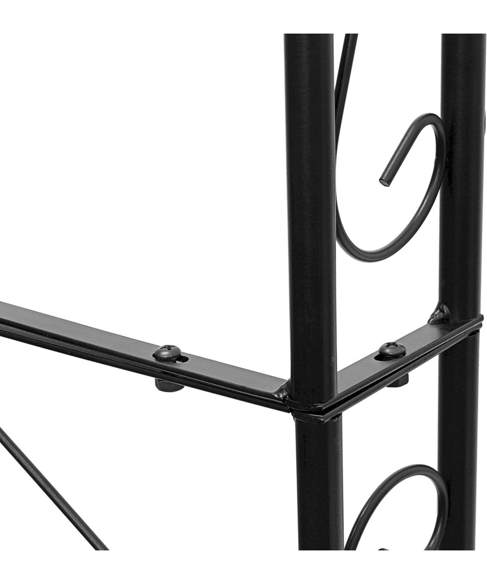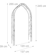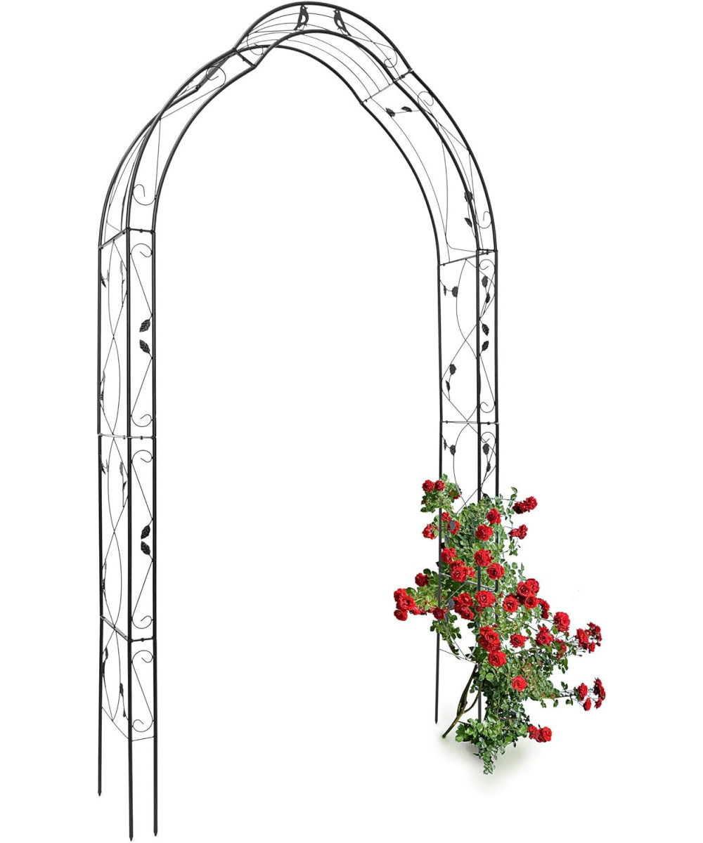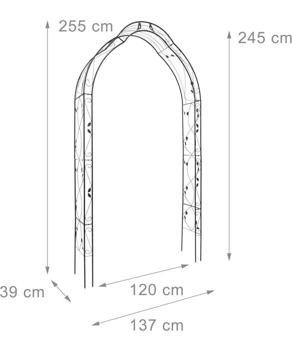 Mit diesem Rosenbogen bringen Sie ein Stück Romantik in Ihren Garten. Die beiden Vögel in der Spitze des Bogens und die Rosen-Ornamente machen nämlich nicht nur zu Traumhochzeiten eine gute Figur. Mit Kletterrosen oder Clematis in voller Blüte wird die Rankhilfe dann endgültig zum Blickfang. Das Gestell besteht aus schwarzem, pulverbeschichtetem Eisen. Es ist dadurch sehr robust und witterungsbeständig. Die filigranen Verzierungen sehen dabei edel und verspielt aus. Tipp: Graben Sie den Torbogen für sicheren Stand einige Zentimeter tief in die Erde. Damit haben Ihre Kletterpflanzen perfekten Halt zum Ranken.