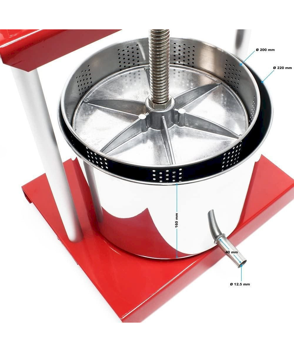 Die handliche Obstpresse/Beerenpresse ist aus Stahl gefertigt und lässt sich schnell zusammenbauen. Die Abmessung der Konstruktion beträgt 30 cm x 25 cm x 45,5 cm. Der doppelte Obstkorb ist aus rostfreiem Edelstahl gefertigt und besitzt die Abmessungen: