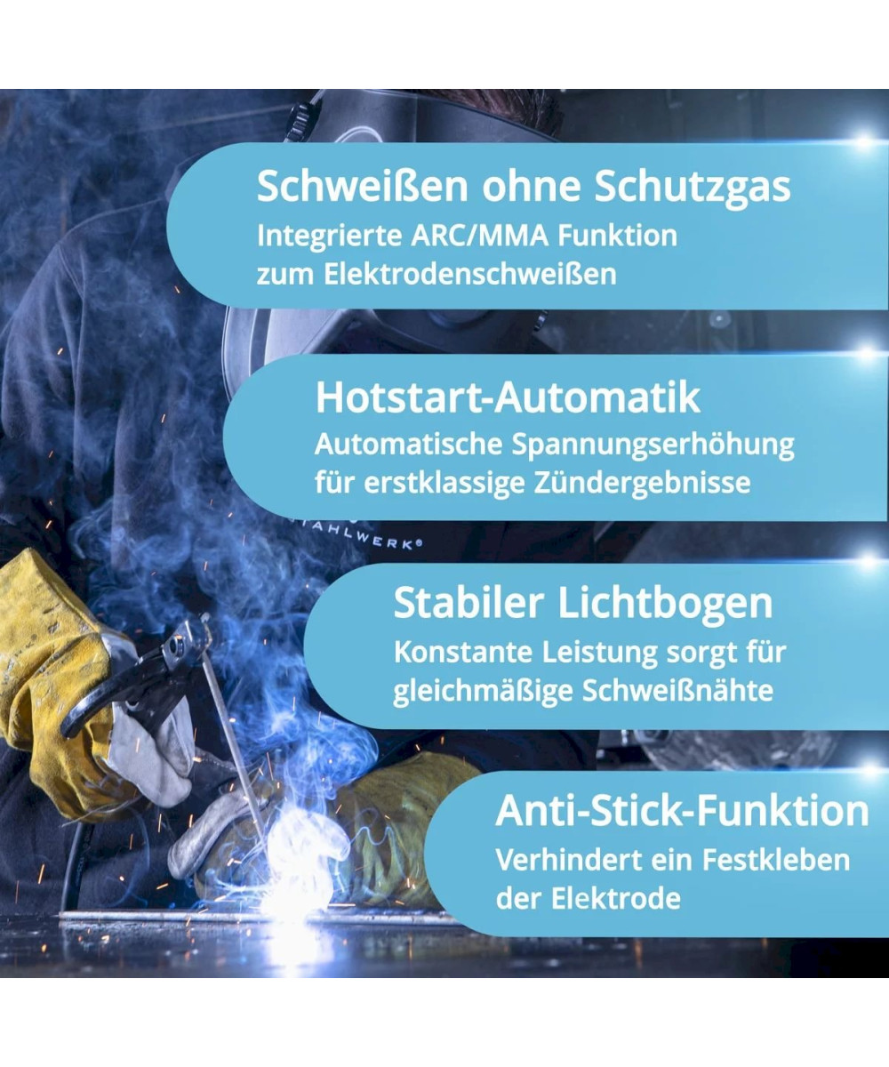 - Anti-Stick - Automatisches Herunterfahren des Schweißstroms beim Klebenbleiben der Elektrode ermöglicht ein einfaches entfernen.