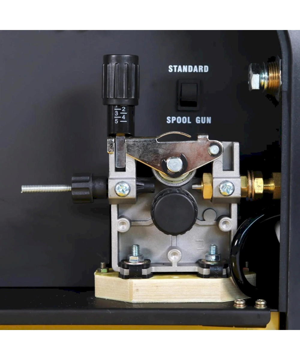 Zum Wechsel in den Fülldrahtbetrieb polen Sie bequem an der Gerätefront um, im Innenraum lässt sich das Gerät von Standard- auf Spoolgunbetrieb umschalten. Eine passende Spoolgun mit 12-poliger Steuerbuchse ist separat erhältlich (Artikel 3148). Zum Aluminiumschweißen sind im Lieferumfang eine 1,0/1,2 mm Drahtrolle und eine Teflonseele enthalten. Im MIG/MAG-Modus lassen sich alle gängigen Metalle verschweißen.