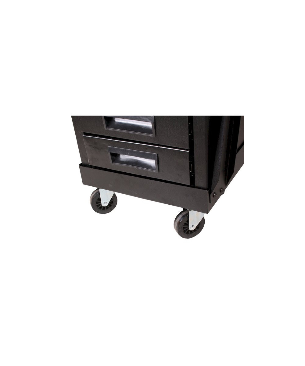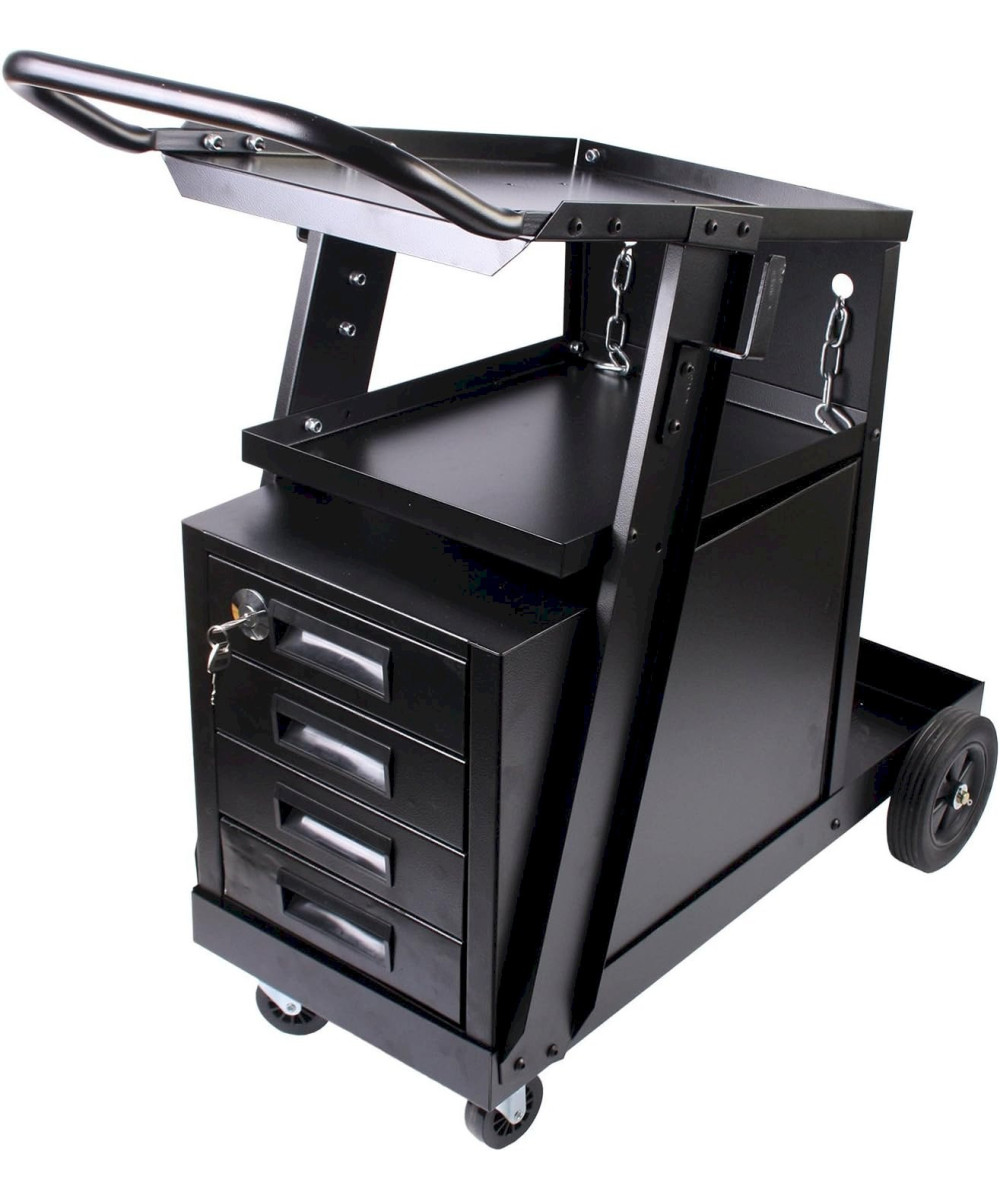 - WIG-Schweißwagen mit Gasflaschenhalter, vier Schweißdrahtaufnahmen, Ausstanzungen für Zubehör und ausziehbarer Inverterebene mit Gurtsicherung