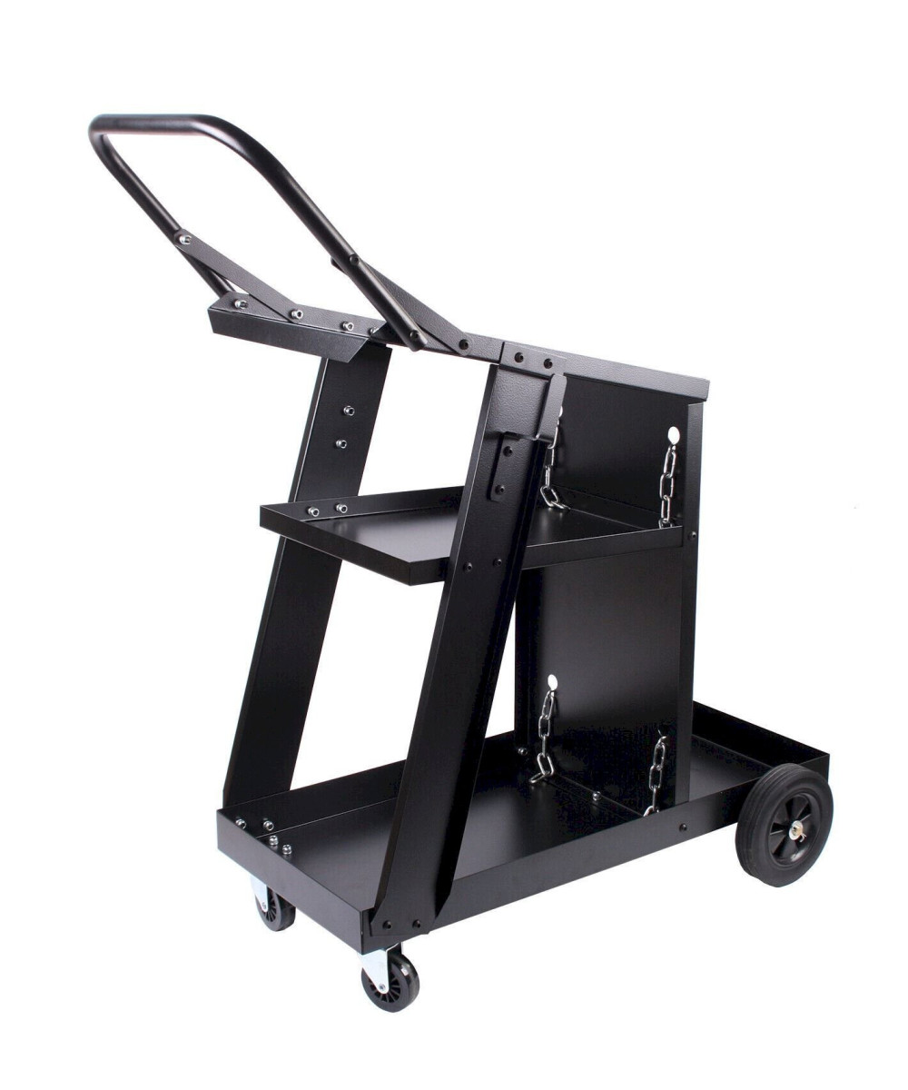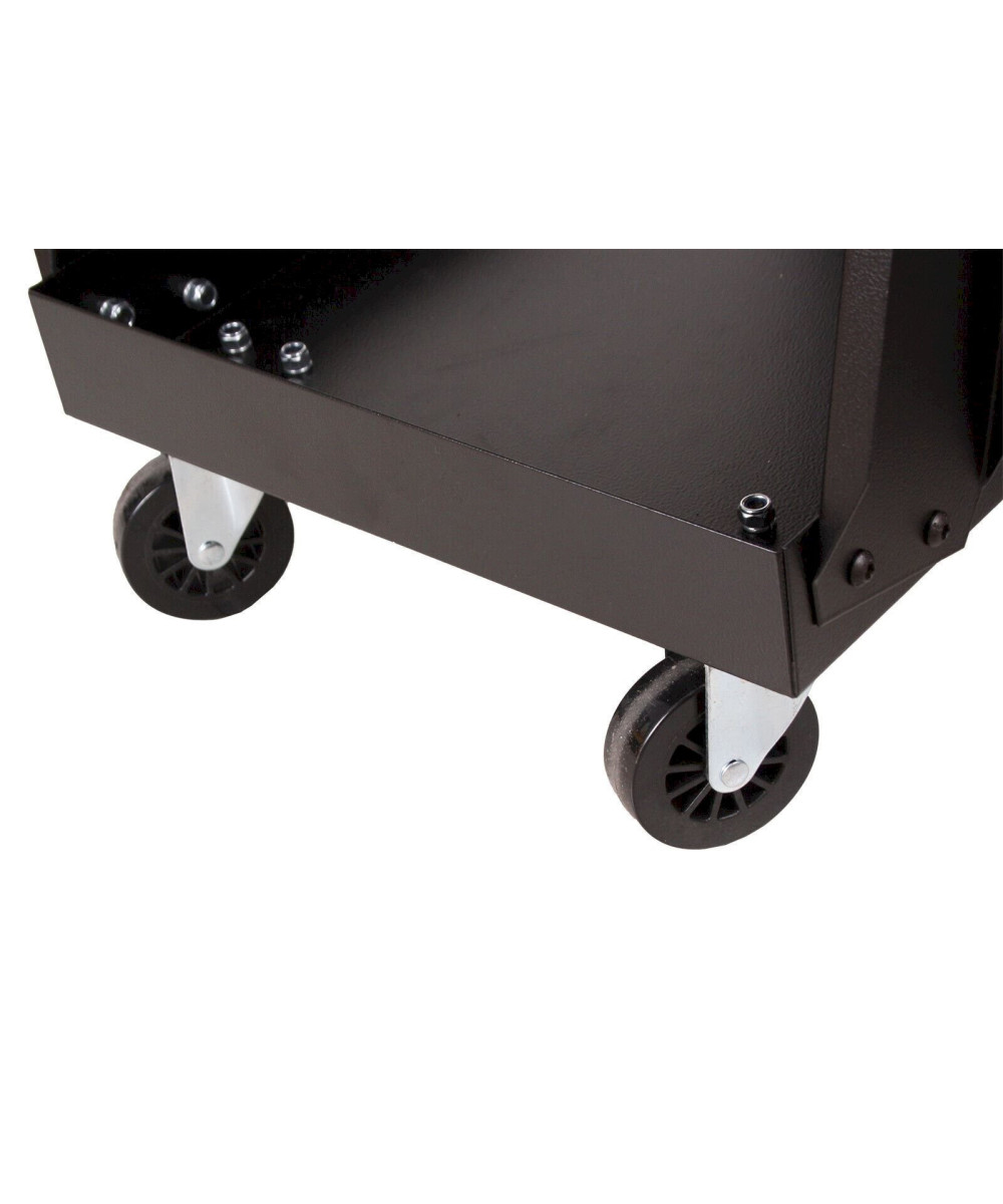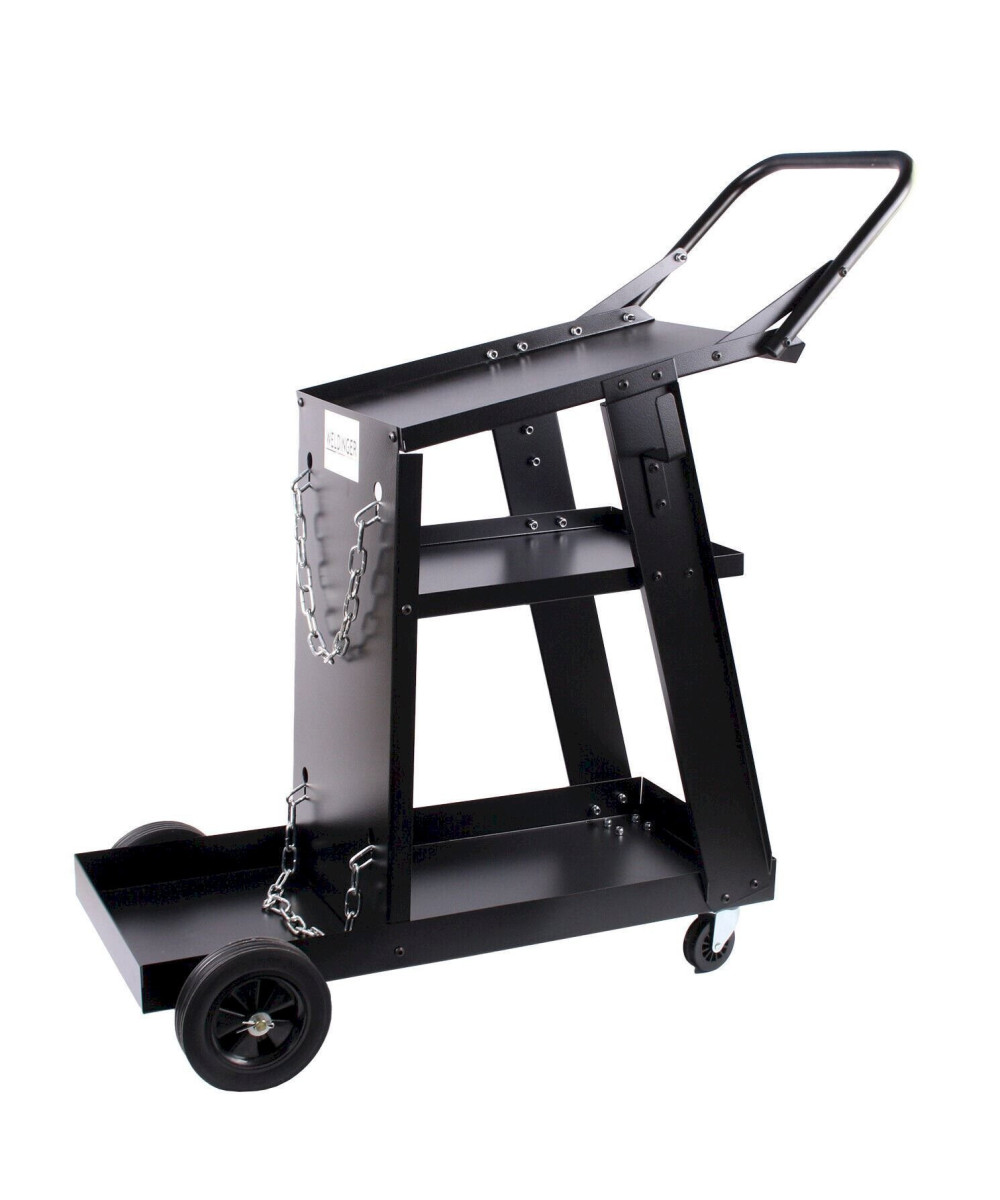 - WIG-Schweißwagen mit Gasflaschenhalter, vier Schweißdrahtaufnahmen, Ausstanzungen für Zubehör und ausziehbarer Inverterebene mit Gurtsicherung