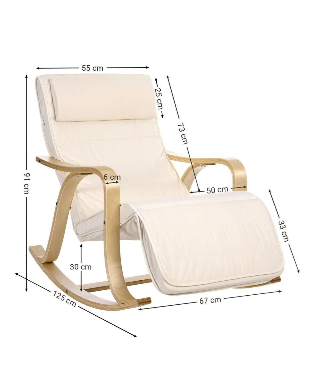 Setzen Sie sich auf diesen geschwungen geformten Schaukelstuhl, stellen Sie die Fußstütze auf die gewünschte Höhe ein (5-fach verstellbar), schließen Sie Ihre Augen und entspannen Sie Körper sowie Seele beim Hin- und Herschaukeln