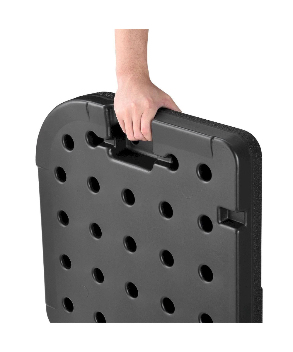 Die vier Beschwerungsplatten sind aus langlebigem HDPE Kunststoff gefertigt. Hart-Propylen ist ein weit verbreiteter Kunststoff und behält auch bei großen Volumeneinheiten seine Form. Zudem trotzt es Regen, Minusgraden und intensiver Sonnenstrahlung.