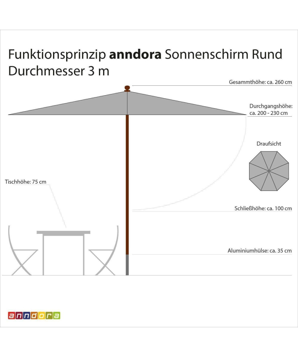 Produktbeschreibunganndora Sonnenschirm 3 m rundDer Sonnenschirm bietet Ihnen im Sommer ein schattiges Plätzchen auf Ihrer Terrasse oder im Garten.