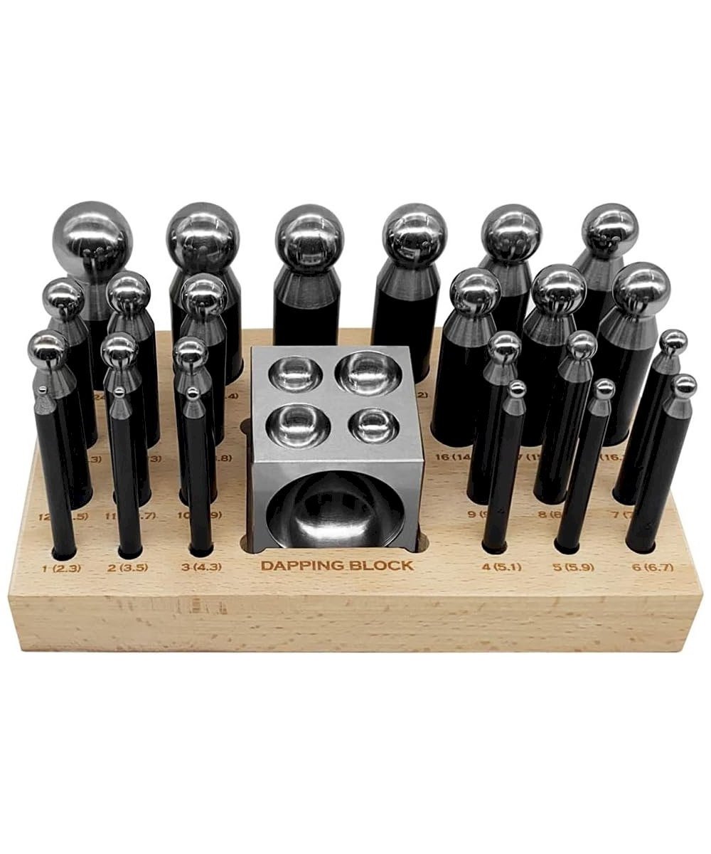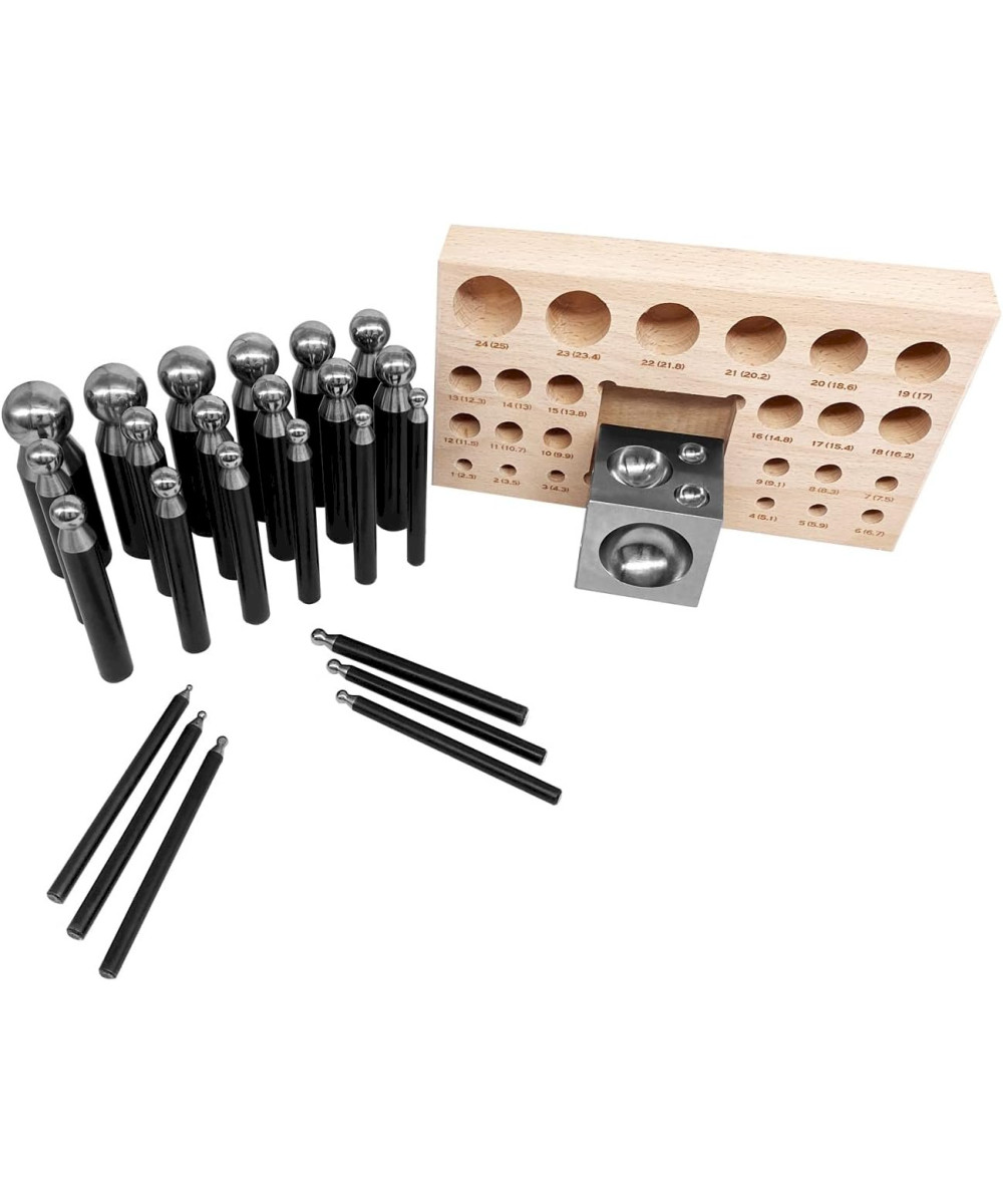 Dieses aus Werkzeugstahl gefertigte Kugelpunzen-Set beinhaltet 24 Kugelpunzen mit Durchmessern von 2,3 bis 25 mm. In der Würfelanke befinden sich 18 kugelförmige Vertiefungen mit Durchmessern von 4,4 bis 41 mm. Punzen und Anke sind gehärtet und poliert. Zur übersichtlichen Aufbewahrung werden sie in einem Buchenholz-Ständer geliefert.