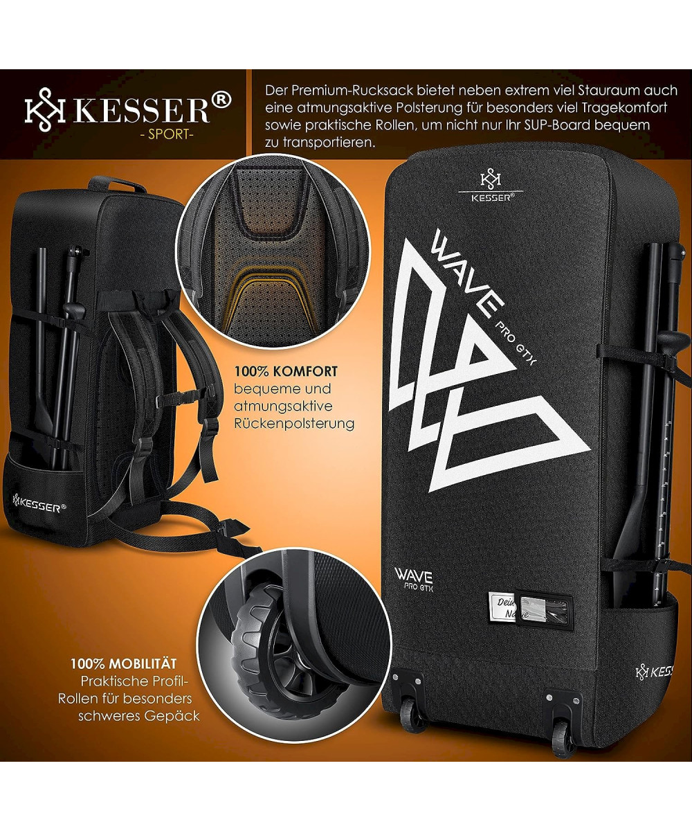 Das aufblasbare KESSER Surfboard ist als Paddelboard oder Kajak verwendbar und für Anfänger bis fortgeschrittene Stand Up Paddling-Fahrer geeignet. Es lässt sich mühelos auf Reisen in dem mitgelieferten Premium Rucksack transportieren. Die Tasche ist zudem gut gepolstert, atmungsaktiv und hat besonders viel Tragekomfort sowie praktische Rollen für besonders schweres Gepäck - so haben Sie das SUP-Board immer dabei und darüber hinaus noch Platz für weitere Dinge. Ebenfalls können Sie in dem Rücksack das mitgelieferte Reparatur-Set optimal verstauen und haben es somit immer griffbereit. Nach der Benutzung kann das KESSER SUP Board ganz einfach zusammengefaltet und in der Tragetasche verstaut werden. So sind das Board, die Hochdruckpumpe und das Paddel im Handumdrehen sicher verpackt und transportbereit.