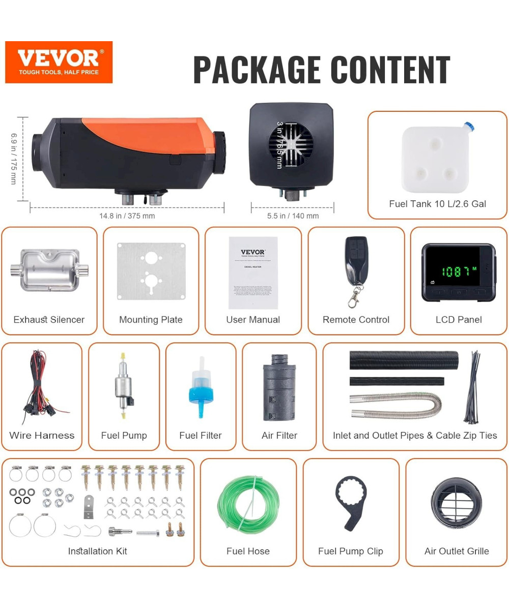 Effiziente Heizung: Heizleistung: 8 kW; Nennspannung: 12 V. Anwendbarer Bereich: 215-269 Fuß² (20–25 m²). Der VEVOR Diesel-Lufterhitzer verwendet einen sandgestrahlten Aluminium-Wärmetauscher für eine schnelle Wärmeerzeugung und -übertragung und sorgt so innerhalb von 10 Minuten für eine angenehme Temperatur in Ihrem Fahrzeug, Boot oder Ihrer Kabine.
