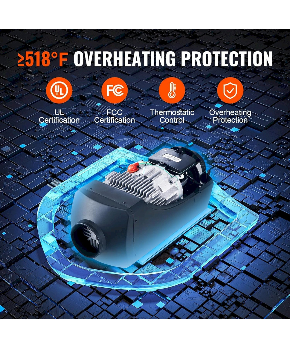Sicher & zuverlässig: Unsere Diesel-Standheizung ist mit einem Hochsicherheitssystem ausgestattet, das einen sorgenfreien Betrieb in verschiedenen Umgebungen wie Autos, Wohnmobilen, Booten und Innenräumen ermöglicht. Es bietet konstante Temperaturregelung, Timerfunktion, Sprachübertragung, Vorwärmung und Überhitzungsschutz bei über 518 °F (270 °C) für ein sicheres und komfortables Erlebnis die ganze Nacht lang.