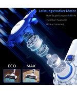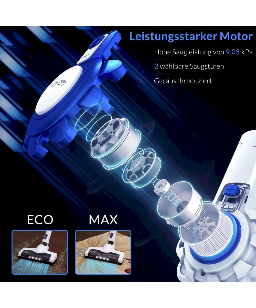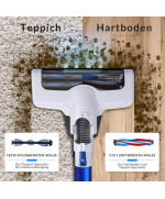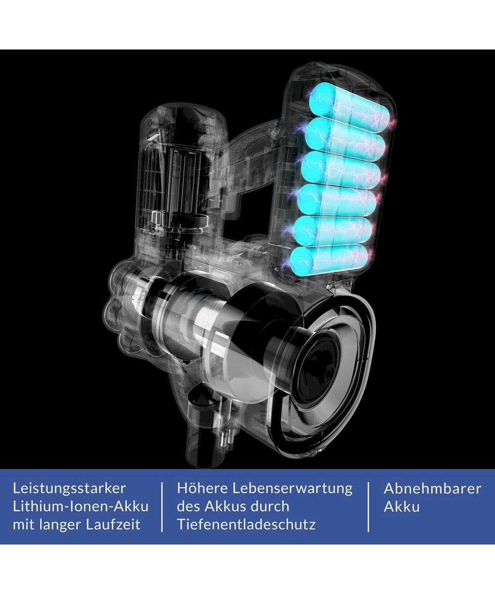 Der Tiefentladeschutz schützt die abnehmbare Batterie vor Schäden, was die Lebensdauer deines Akkus verlängert. Mit der praktischen Wandhalterung hast du den Staubsauger immer griffbereit. Die zwei Leistungsstufen, Eco und Max, ermöglichen dir die Anpassung an verschiedene Bodenbeläge, wie Teppiche und Fliesen. Mit zusätzlichen LEDs an den Bodenbürsten erkennst du Schmutz ganz schnell auf deinem Boden.