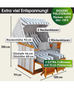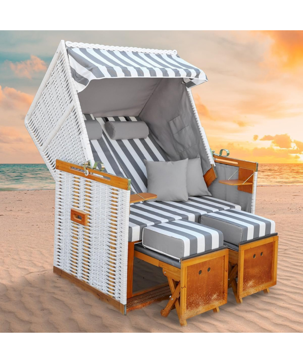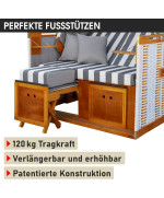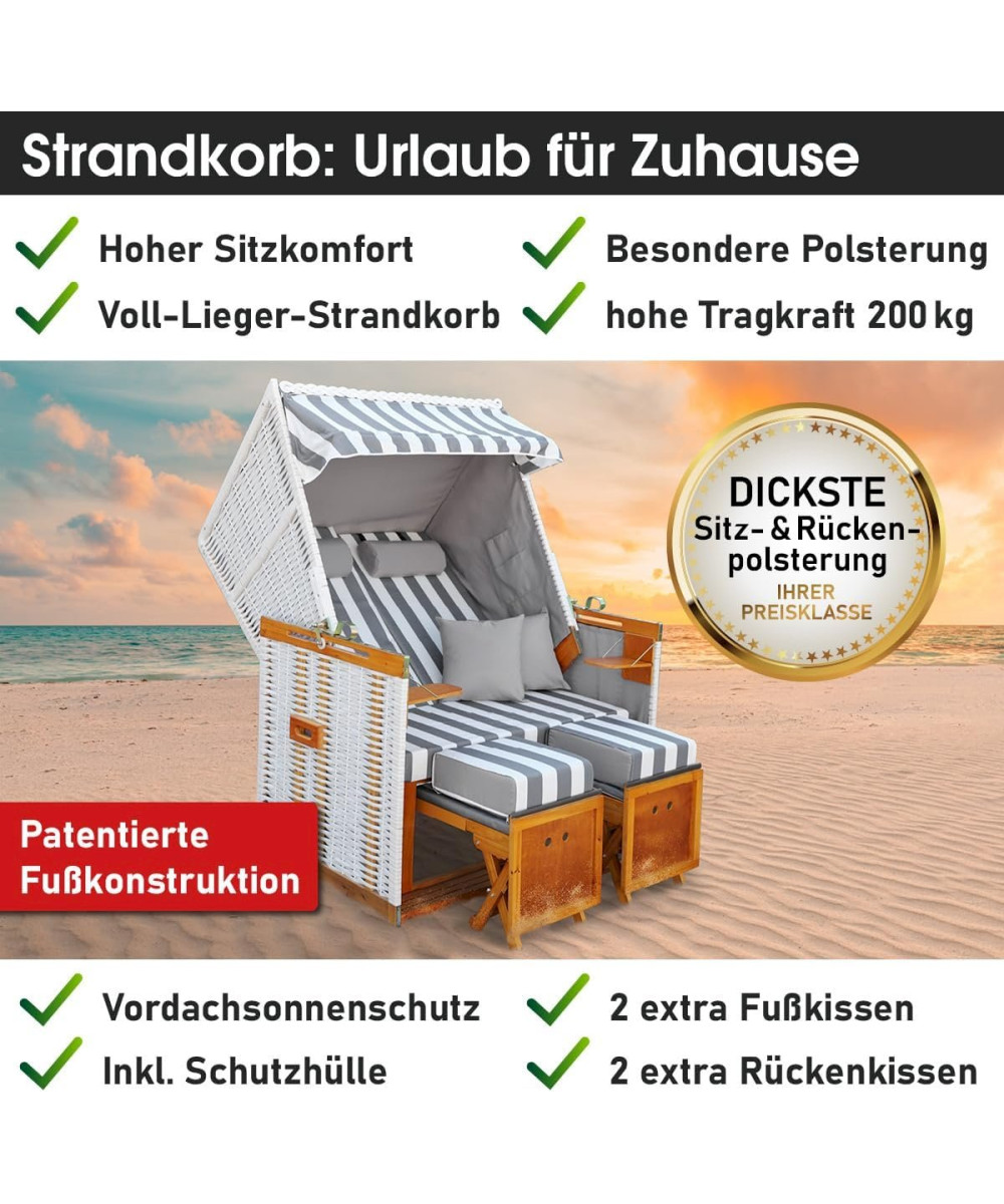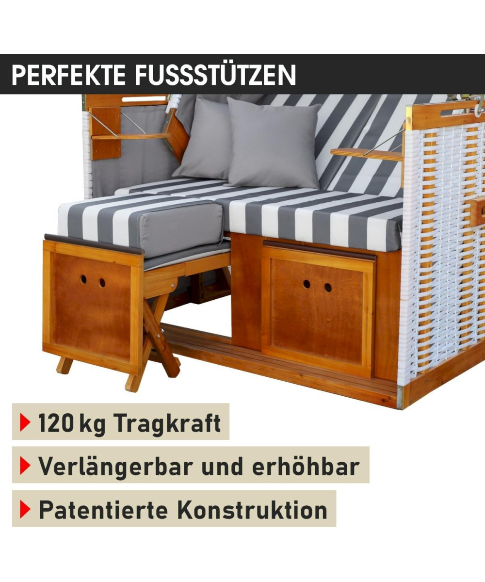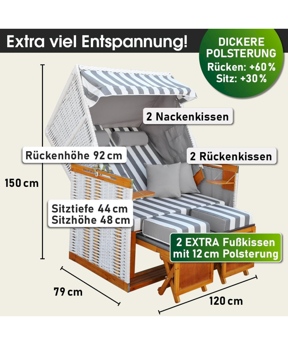 2-Sitzer Strandkorb mit besonders dicker Polsterung, Volllieger Strandkorb für Garten, Terrasse und Balkon, Ausziehbare und höhenverstellbare Fußbänke