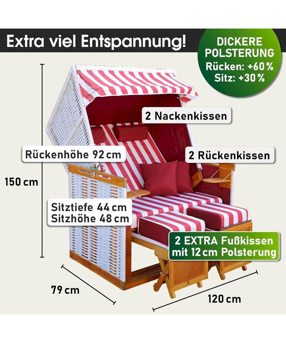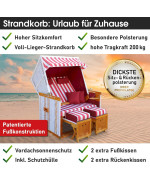 Strandkorb NORDERNEY DELUXE 120cm breit für 2 Personen rot/weiss gestreift