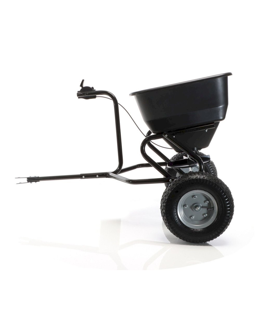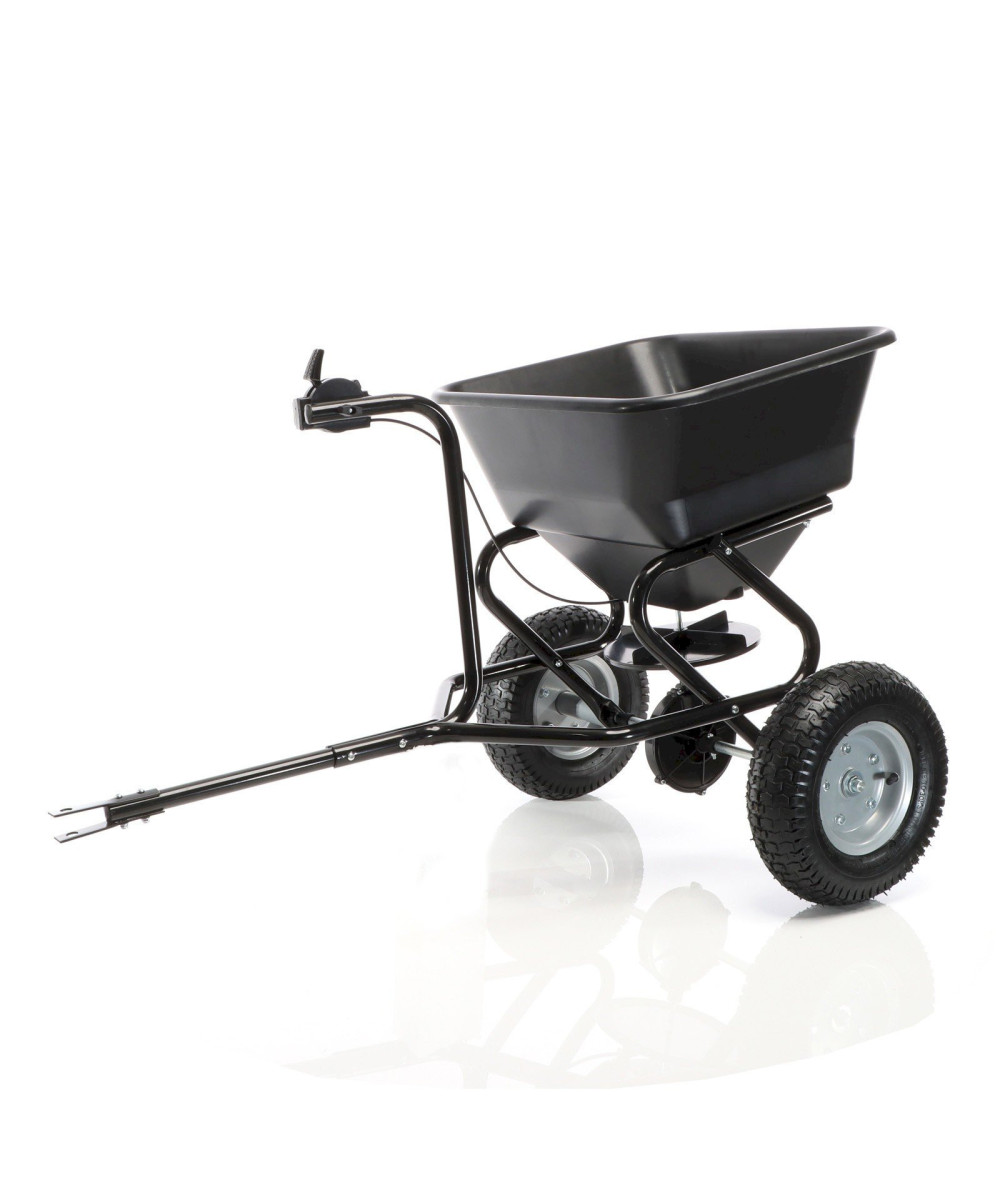 Mit diesem Streuwagen erhalten sie einen praktischen Helfer für die Bereiche Landwirtschaft, Gewerbe und Haushalt. Denn es handelt sich um einen Streuwagen für Aufsitzmäher mit einer Anhängehöhe von 20 - 50 cm. Dank der flexiblen Kupplung lässt sich dieser Streuwagen mit fast allen Aufsitzmähern nutzen. Die breiten Luftreifen sorgen für gute Laufeigenschaften auch auf unebenem Untergrund. Dadurch, dass der Antrieb für den Streuer wartungsfrei ist, wird eine Verunreinigung des Streugutes verhindert.