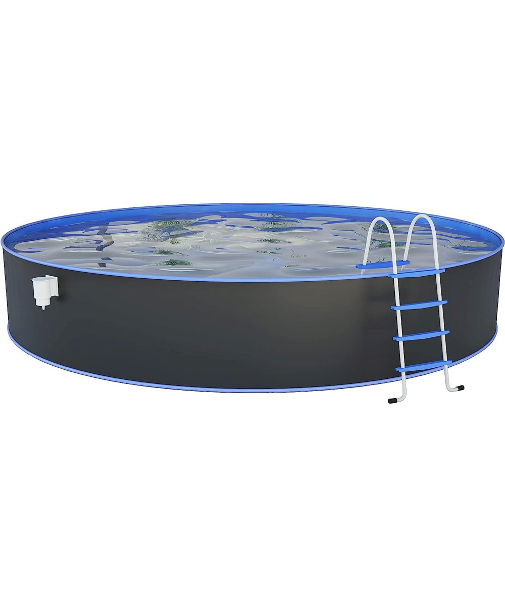 Das Nuovo Pool Set Rund hat eine Größe von Ø 450 x 120 cm und der Wasserinhalt beträgt 17.200 l. Eine im Set enthaltene Leiter ermöglicht Ihnen einen komfortablen Einstieg. Der mitgelieferte Skimmer übernimmt die Reinigung der Wasseroberfläche. Der robuste, verzinkte, kunststoffbeschichtete Stahlmantel hat eine Stärke von ca. 0,4 mm.