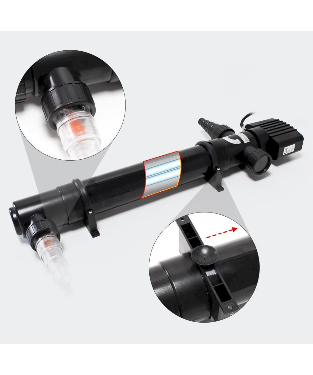 Durch die beiden Öffnungen des UVC-Entkeimers zirkuliert das Wasser, dabei werden sämtliche Unreinheiten, wie Schwebealgen, Krankheitserreger, Bakterien oder Parasiten reduziert. Je länger dieser Kontakt aufrechterhalten wird und umso höher die UVC-Leistung (Watt) ist, desto effektiver ist die Abtötung.