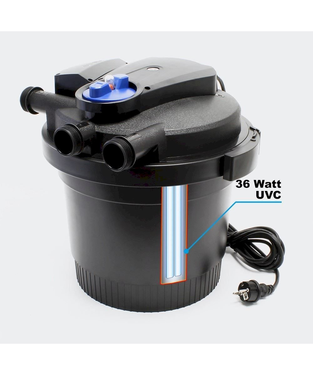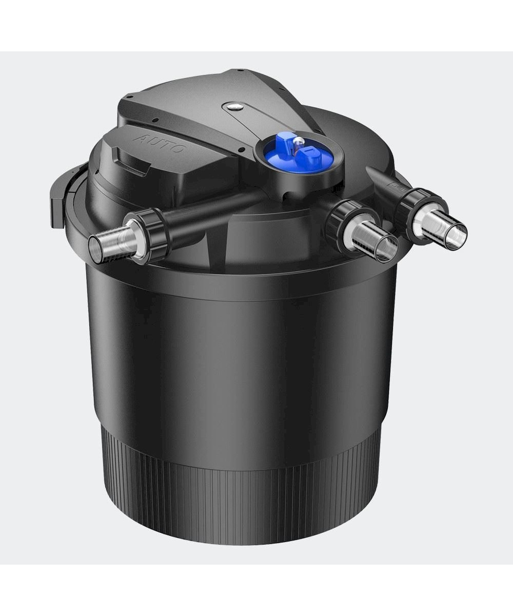 Mechanisch und biologisch arbeitender Druckteichfilter mit integriertem UVC-Teichklärer. Alle Anschlüsse und die Technik befinden sich im Deckel, der Teichfilter kann problemlos eingegraben werden.