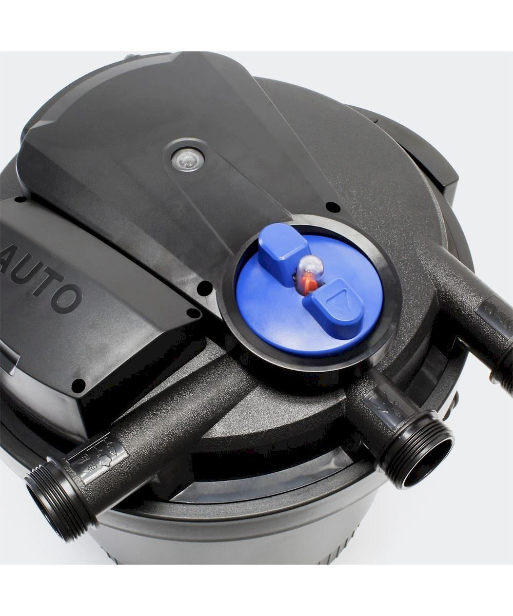 Der Druckteichfilter verfügt über ein modern entwickeltes Reinigungssystem, das sich über einen Schalter mit 2 Funktionen regeln lässt.