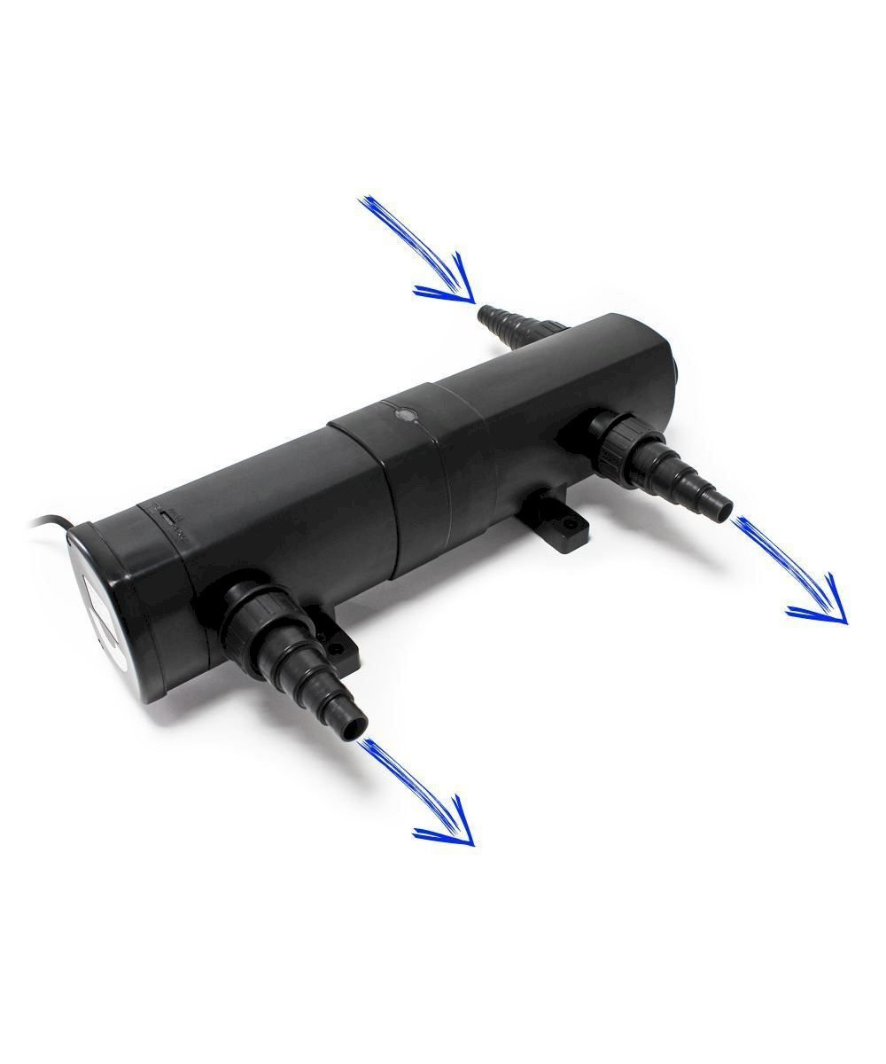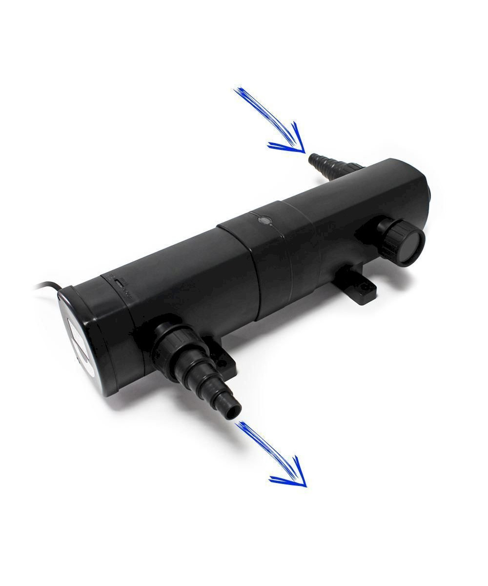 Durch die beiden Öffnungen des UVC-Entkeimers zirkuliert das Wasser, dabei werden sämtliche Unreinheiten, wie Schwebealgen, Krankheitserreger, Bakterien oder Parasiten reduziert. Je länger dieser Kontakt aufrechterhalten wird und umso höher die UVC-Leistung (Watt) ist, desto effektiver ist die Abtötung.