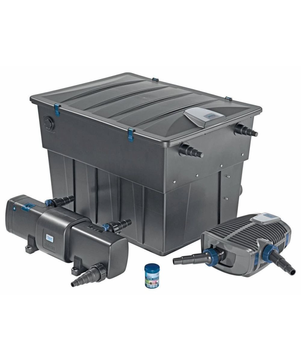 Das Oase BioTec ScreenMatic2 Set 60000 , bestehend aus einem Durchlauffilter BioTec ScreenMatic 60000 mit selbstreinigendem UVC-Vorklärgerät Bitron C 55 W und energieeffizienter Filterpumpe AquaMax Eco Premium 16000 sowie einem BioKick Filterstarter zur Erstbesiedlung mit Mikroorganismen, eignet sich für Teiche von 6 - 60 m. Das Set kombiniert mechanisch-biologische Reinigung und effektive UVC-Technik und lässt sich ganz einfach und bequem installieren.