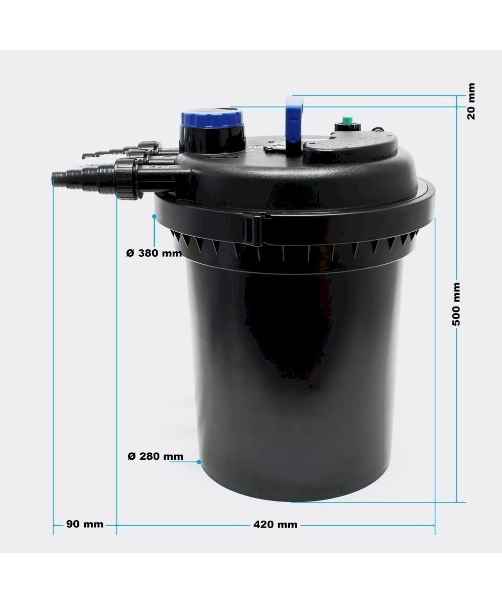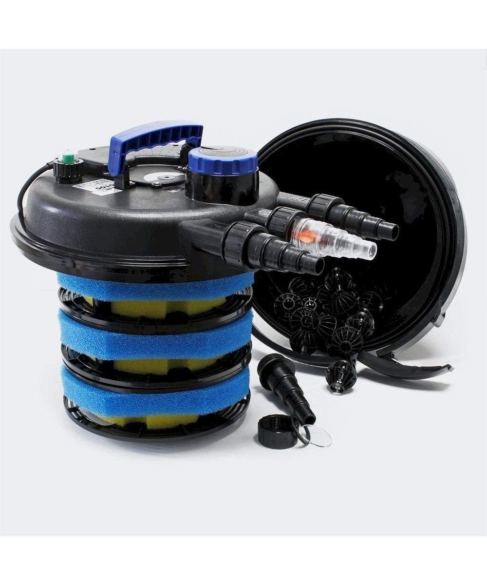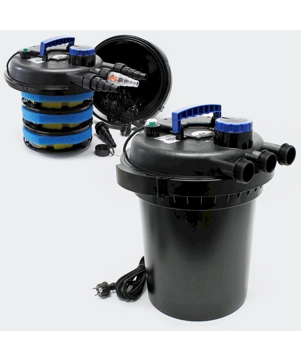 Mechanisch und biologisch arbeitender Druckteichfilter mit integriertem UVC-Teichklärer. Alle Anschlüsse und die Technik befinden sich im Deckel, der Teichfilter kann problemlos eingegraben werden.