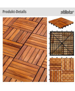 Unsere Holzfliesen von Stilista sind aus wetterfesten und robusten Akazienhartholz gefertigt, welche nach der Herstellung mit einem entsprechendem Pflegeöl behandelt wurden. Die Terrassenfliesen sind 30 x 30 x 2,4 cm groß. Im Lieferumfang enthalten sind jeweils 33 Fliesen dies entspricht etwa 3mq.