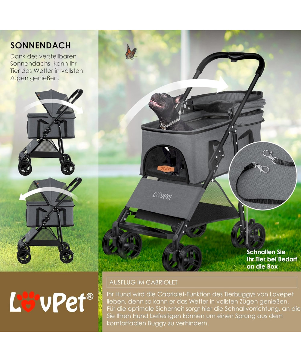Ihr Hund wird die Cabriolet-Funktion des Stroller von LOVPET lieben - denn so kann er das Wetter in vollen Zügen genießen. Für die optimale Sicherheit sorgt hier die Schnallvorrichtung, an die Sie Ihren Hund befestigen können um einen Sprung aus dem komfortablen Buggy zu verhindern.
