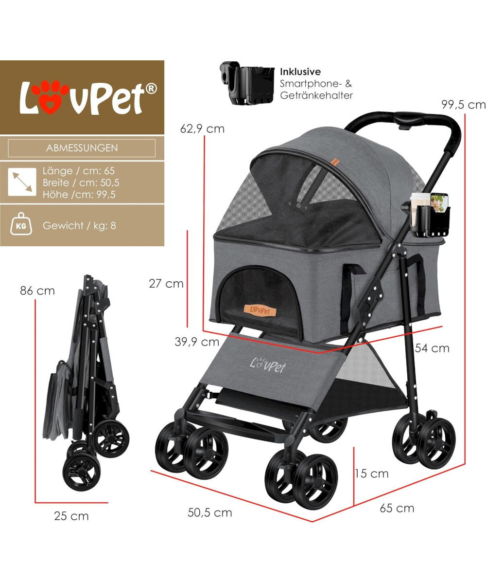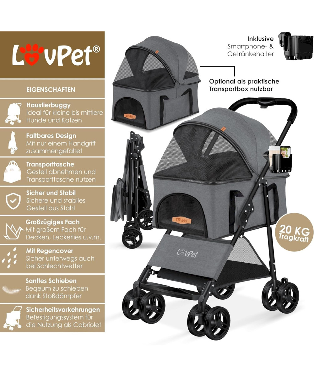 Der Hundekinderwagen der Marke LOVPET verwandelt sich bei Bedarf schnell und unkompliziert in eine Hundetransportbox ohne Gestell, diese können Sie ganz bequem in der Hand oder in Ihrem Auto transportieren! Dadurch schränkt Sie Ihr Hund bei keinem Besuch oder Wandertag ein und kann Sie problemlos bei jedem Ausflug begleiten.