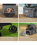 Genießen Sie wundervolle Momente mit Ihrem Vierbeiner an der frischen Luft und profitieren Sie von einer komfortablen Fahrt dank der vorteilhaften und robusten 360° Räder. Die vollgummierten Reifen aus EVA eignen sich zudem auch auf besonders anspruchsvollen Strecken wie zum Beispiel Wald- und Feldwegen. Zudem können Sie ausreichend Leckerlies, Spielzeuge, Nahrung und vieles mehr in dem großzügigen Korb transportieren. Das atmungsaktive Meshgewebe sorgt für eine hervorragende Belüftung im Innenraum.