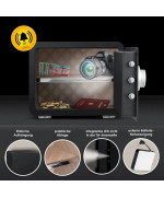 Durch die 4mm dicke Stahltür sind Ihre Dokumente, Bargeld, Schmuck oder andere wichtige Unterlagen sicher vor Diebstahl geschützt. Der Tresor verfügt zudem über ein digitales LCD- Anzeigen- Element mit akustischem Bediensignal.