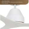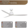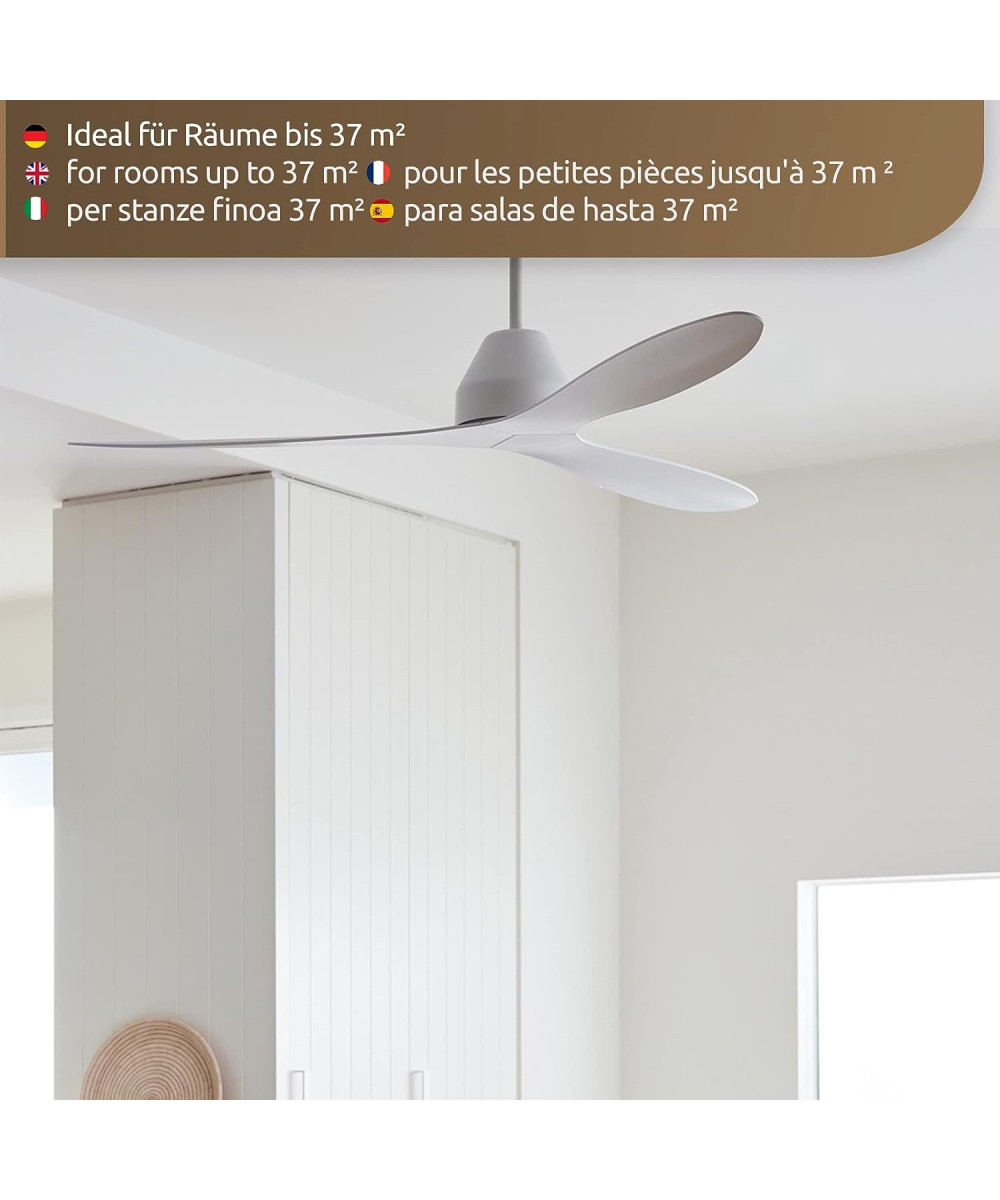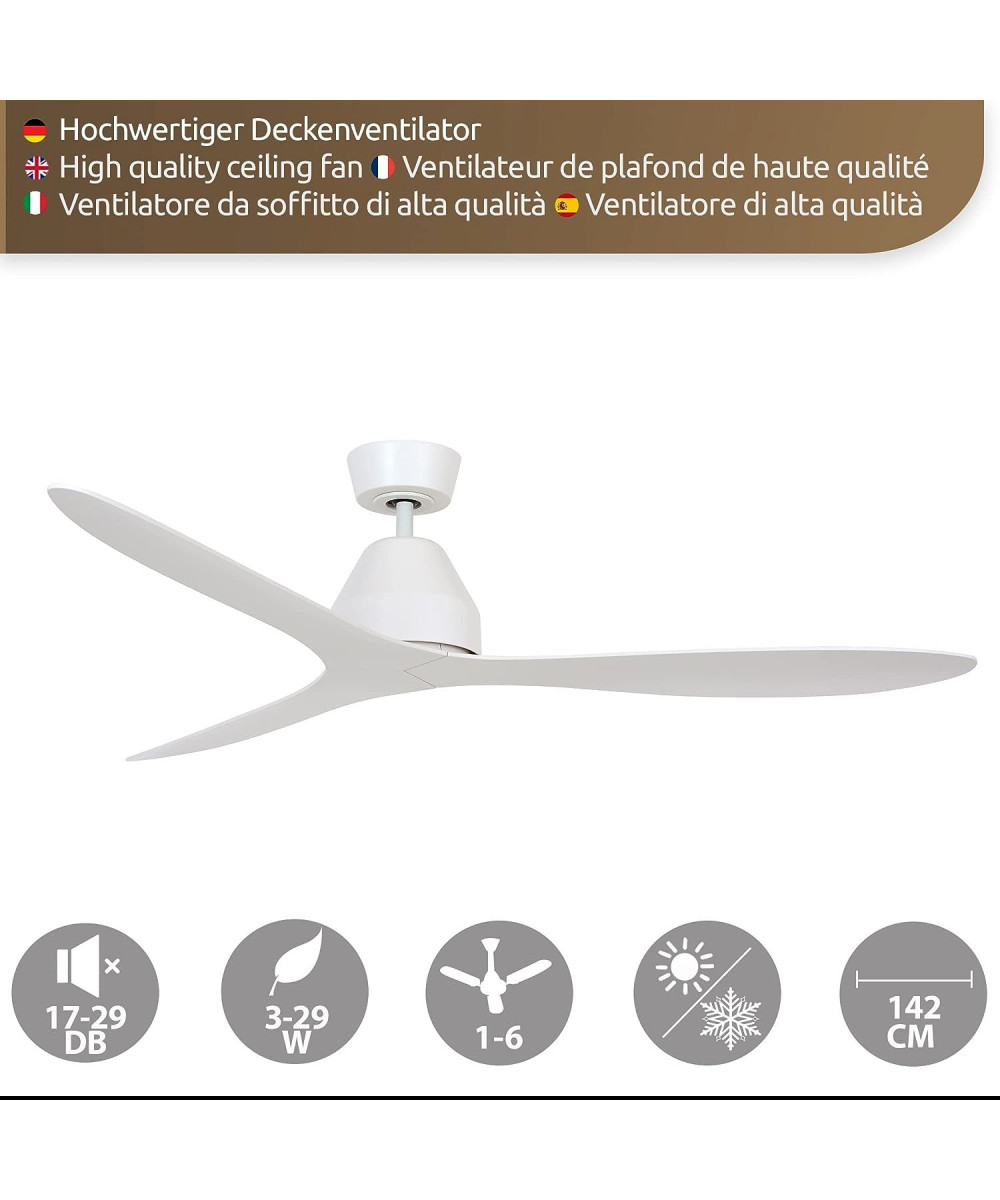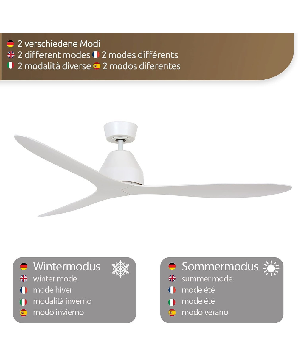 Der Deckenventilator Whitehaven hat einen sparsamen DC Motor. Sein Gehäuse und die drei ultraflachen Flügel sind ganz in Weiß gehalten. Eine 6 Speed Fernbedienung ist im Lieferumfang enthalten, mit ihr lässt sich auch bequem vom Sommer- auf Wintermodus umschalten. Mit seinem Durchmesser von 142 cm ist er ideal für Räume mit einer Größe von bis zu 40m². Dank der erwähnten Sommer/Winter-Funktion hilft er in beiden Jahreszeiten die Energiekosten zu senken.