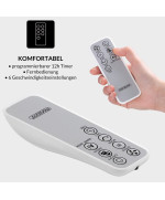 Mit der Fernbedienung können neben vielen anderen Features die 6 verschiedenen Geschwindigkeitsstufen eingestellt werden. Der Timer kann sowohl am Touchdisplay, als auch über die Fernbedienung zwischen 1 und 12 Stunden eingestellt werden. Das große Farbdisplay mit Temperatur- und Einstellungsanzeige ist auch auf große Entfernung und im Dunklen klar ablesbar.