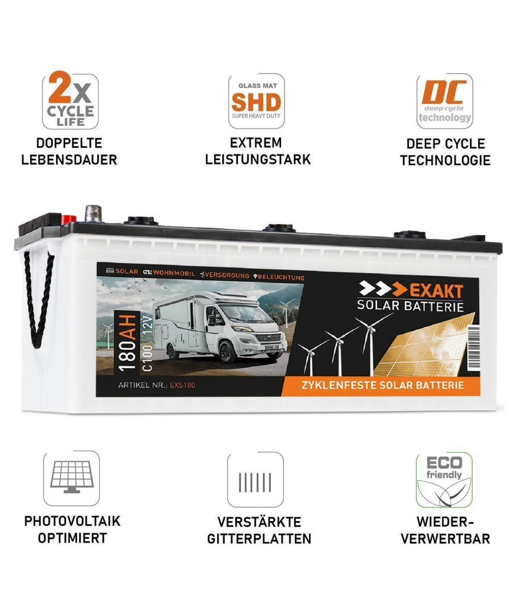 EXAKT Solarbatterie 180Ah 12V Wohnmobil Versorgung Boot Camping Batterie