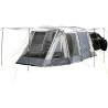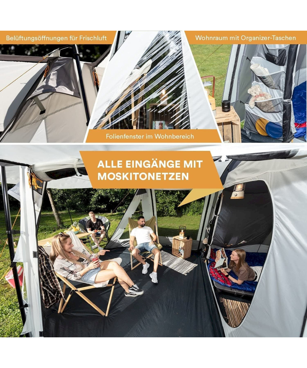 Drei weitere Eingänge im Wohnbereich sorgen für viel Flexibilität in Sachen Licht und Luft. Mit den vier mitgelieferten Aufstellstangen lassen sich jeweils 2 der Eingänge in ein praktisches Sonnendach umwandeln, wenn Schatten benötigt wird, sind jedoch wasserdicht verschließbar, wenn das Wetter nicht so mitspielt. Die zwei Seiteneingänge sind zusätzlich gegen Insekten mit Netzgewebe ausgestattet und die Dreiecksfenster vorne haben beide eine Jalousie zur Abdunkelung.