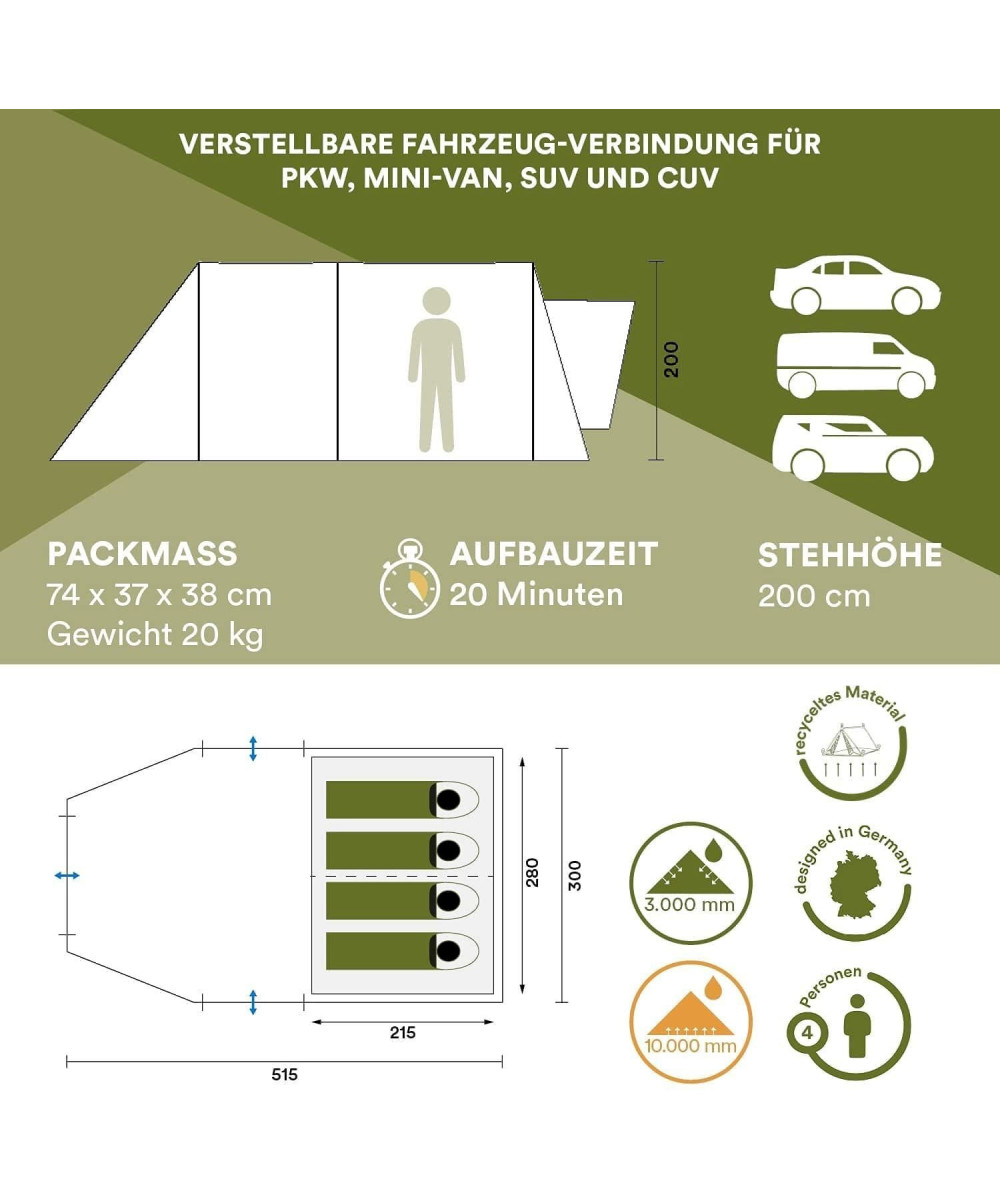 Die fest verschließbare Tür hinten in der Kabine gibt direkten Zugang zur Schleuse zum Auto und kann auch als zusätzlicher Eingang benutzt werden, wenn das Auto nicht dort parkt. Tagestouren mit dem Auto sind kein Problem: in wenigen Minuten werden die Spanngurte gelöst und das Vorzelt wird zum vollwertigen Stand-alone-Zelt!