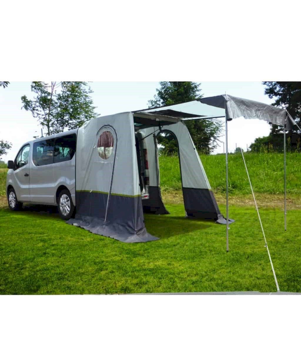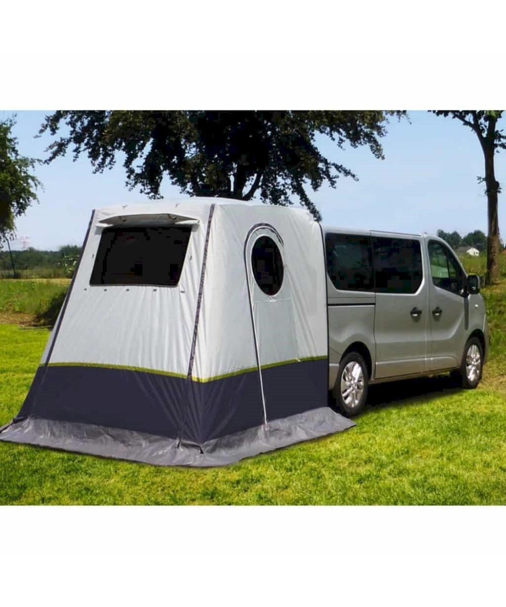 Mit besonders großem Innenraum, für Feldbett, Fahrräder, o.ä. Heckzelt einfach über geöffnete Heckklappe ziehen und am Boden befestigen.