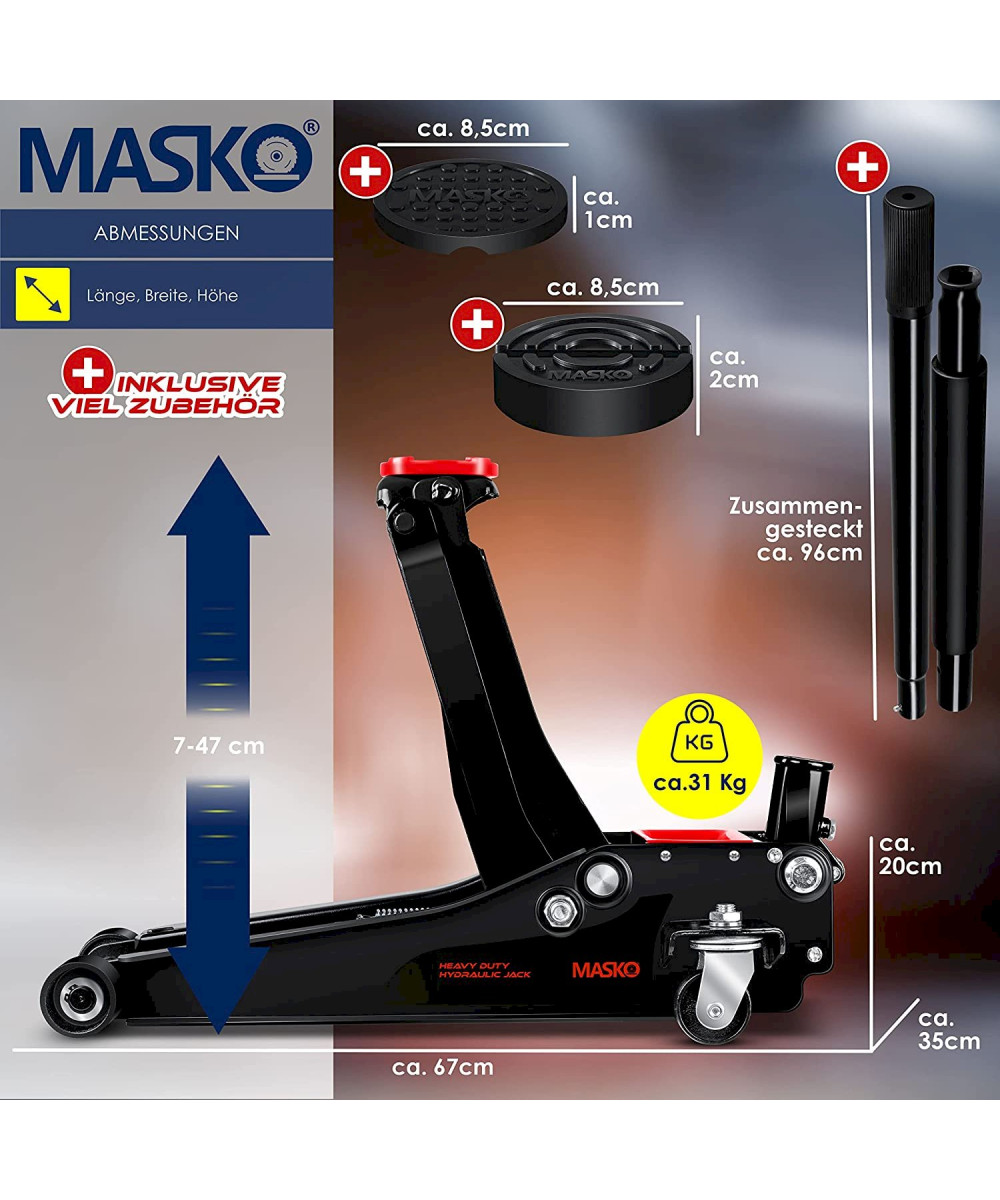 • Maße Wagenheber: 67cm x 35cm x 20cm (LxBxH)